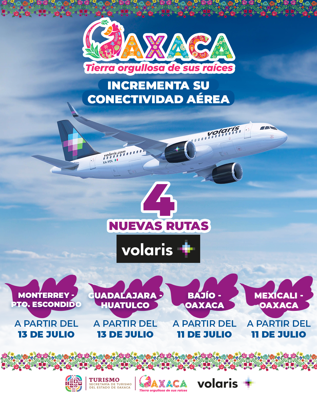Oaxaca de Juárez, Oax. 30 de mayo de 2023.- La Secretaría de Turismo del Gobierno del Estado anunció que, a partir del 11 de julio, Oaxaca tendrá cuatro nuevas rutas aéreas que conectarán a los tres principales destinos de la entidad con otros del país, a través de la aerolínea Volaris.