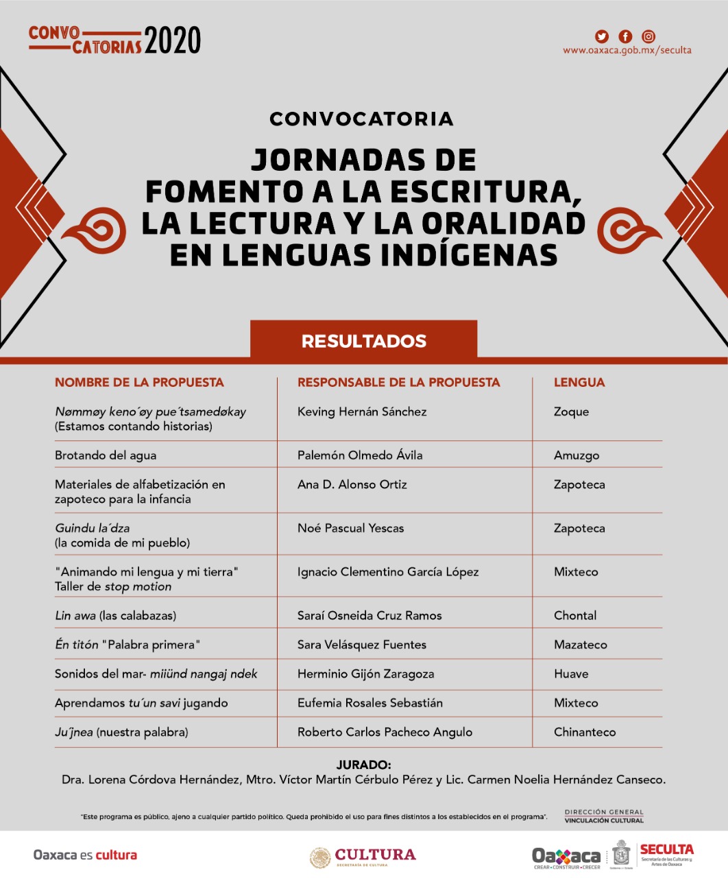 Así mismo, anunció a los seleccionados: Con la propuesta “Nømmøy keno´øy pue´tsamedøkay” (Estamos contando historias), Keving Hernán Sánchez; con “Brotando del Agua”, Palemón Olmedo Ávila; con “Materiales de Alfabetización en Zapoteco para la Infancia”, Ana Alonso Ortiz; con “Guindu la´dza” (la comida de mi pueblo), Noé Pascual Yescas Ignacio; con el Taller de stop motion «Animando mi lengua y mi tierra», Clementino García López.