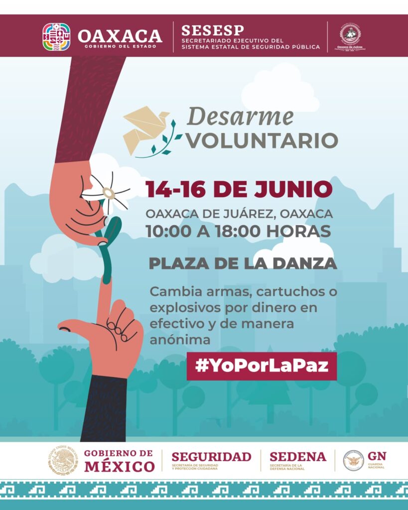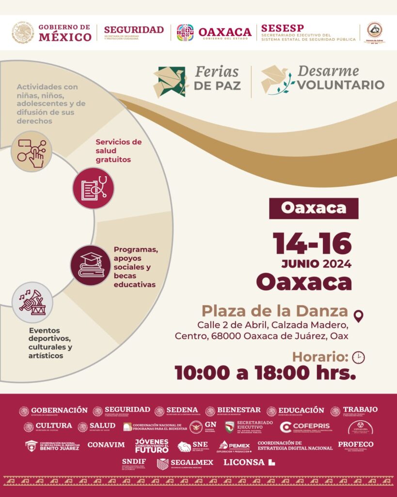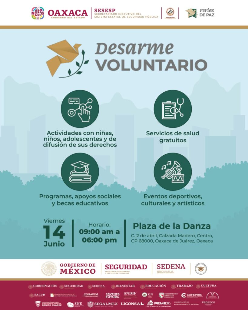 Oaxaca de Juárez, Oax. 10 de junio de 2024.- Con el objetivo de retirar el mayor número de armas de fuego, municiones o explosivos en posesión de la ciudadanía, prevenir accidentes en hogares, vía pública y reducir la violencia, del 14 al 16 de junio se llevará a cabo la Feria de Paz y Desarme Voluntario 2024 en la Plaza de la Danza de 10:00 a 18:00 horas.