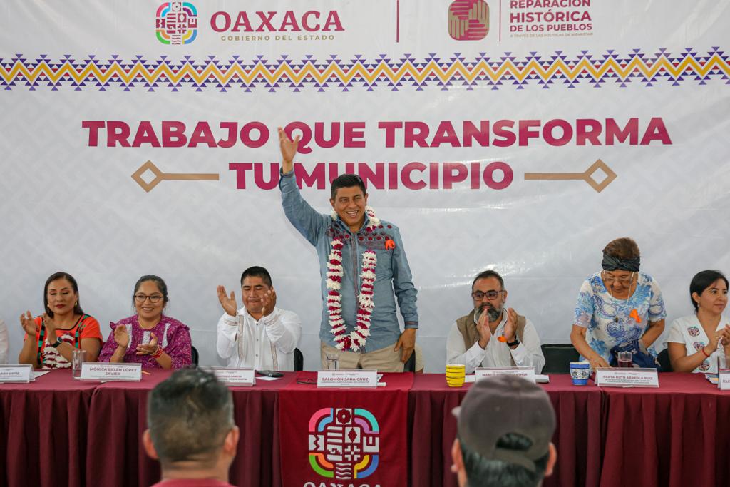 San Martín Toxpalan, Oax. 26 de octubre de 2023.- Con aplausos y muestras de cariño, mujeres y hombres de esta localidad recibieron al Gobernador del Estado Salomón Jara Cruz, quien presentó en este municipio de la Sierra de Flores Magón, la estrategia Trabajo que Transforma tu Municipio, con la cual destinará 24 millones 539 mil pesos para proyectos que detonarán el desarrollo de la población, especialmente de los grupos prioritarios.