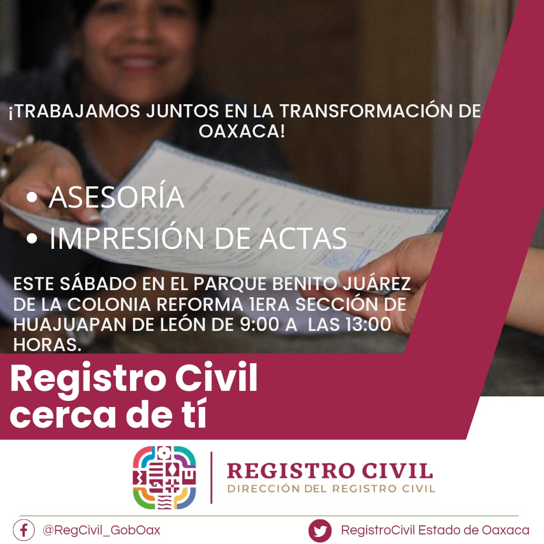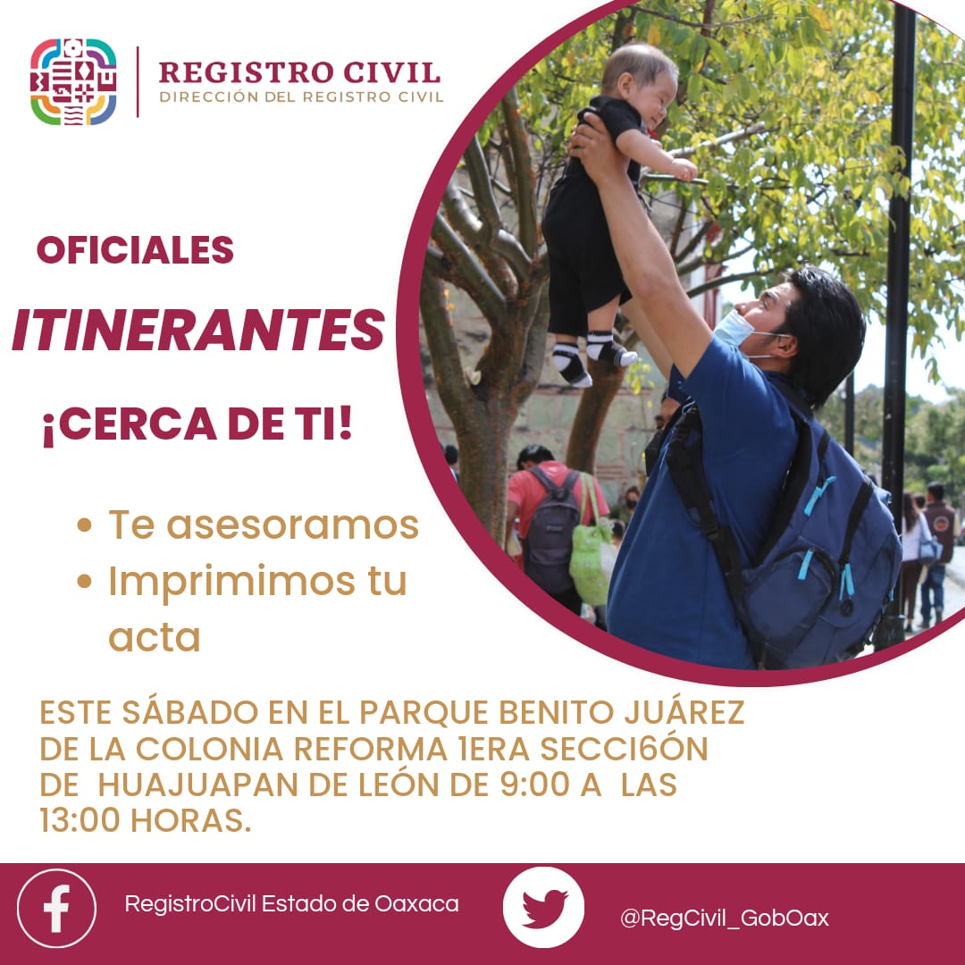 Oaxaca de Juárez, Oax., 14 de abril de 2023.- El Gobierno del Estado a través de la Dirección del Registro Civil iniciará este sábado 15 de abril las jornadas itinerantes “Cerca de ti” con el fin de brindar asesorías gratuitas sobre diversos trámites y la impresión de actas de nacimiento. La primera se realizará en la colonia Reforma Primera Sección del municipio de Huajuapan de León.