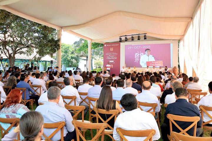 Oaxaca de Juárez, Oax. 27 de octubre de 2025.- El Gobernador Salomón Jara Cruz colocó la primera piedra de lo que será el centro comercial y de entretenimiento “Parque Oaxaca”, un moderno espacio que transformará la capital del estado en un polo de desarrollo, inversión y bienestar para las y los oaxaqueños y en el que se ejercerá una inversión de 6 mil millones de pesos.