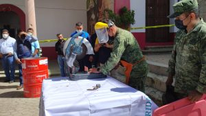 Villa de Etla, Oax., 22 de septiembre de 2022.-A fin de eliminar los riesgos por armas de fuego, municiones o explosivos en los hogares y en las calles, este jueves en la Villa de Etla, en la región de los Valles Centrales, dio inicio el programa de canje de armas por dinero en efectivo.