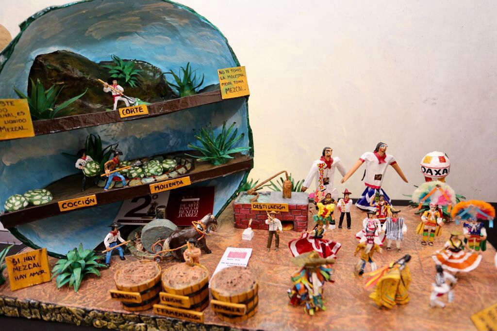 En el taller del maestro artesano, Ivette Morán de Murat pudo observar las obras en miniatura, entre las que destaca la reproducción de todo el proceso de elaboración del mezcal, desde el corte del agave, proceso de cocción, y de molienda.