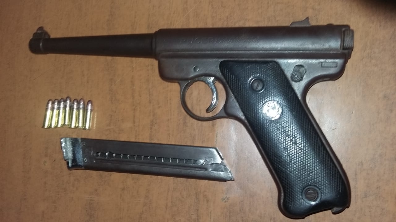 El antes mencionado portaba un arma calibre 22, con la leyenda Ruger 22, cal., long rifle automatic pistol y un cargador metálico abastecido con siete cartuchos útiles calibre 22