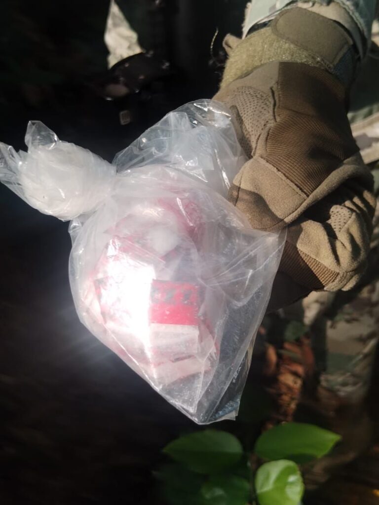 Además de una bolsa tipo costalilla en la que se localizaron 68 bolsas de plástico con hierba con las características de la marihuana y 92 más con presunto cristal.