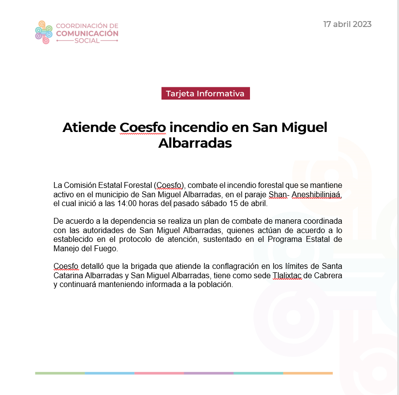 Atiende Coesfo incendio en San Miguel Albarradas