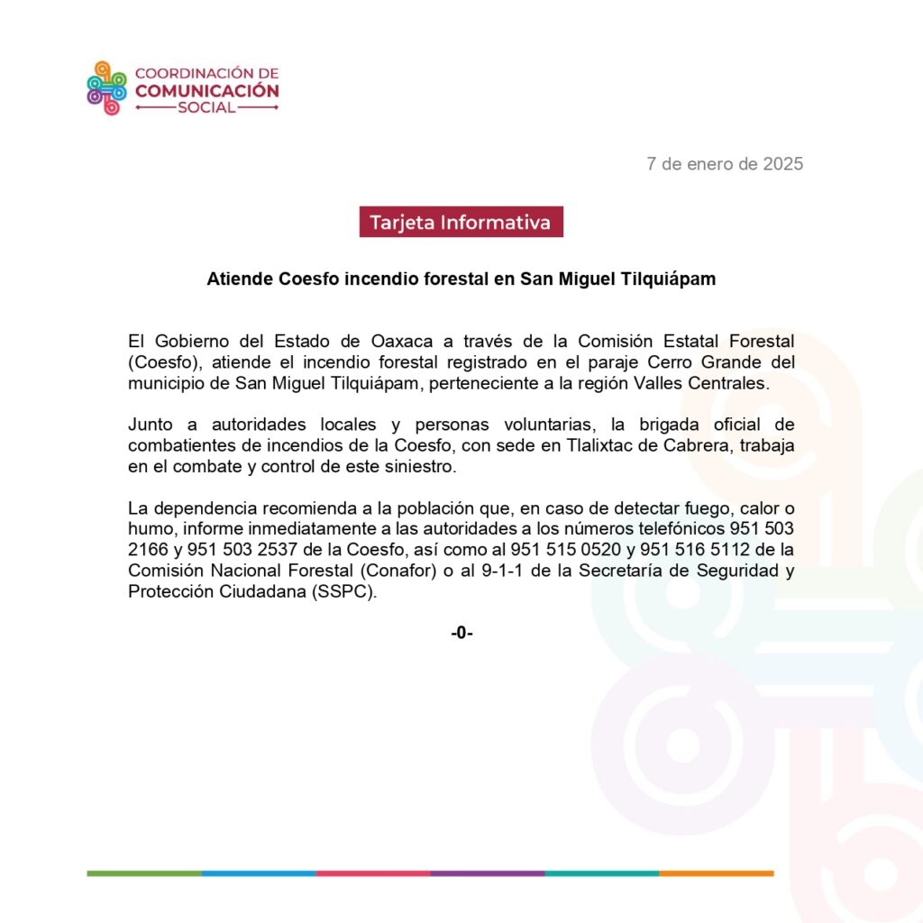 La dependencia recomienda a la población que, en caso de detectar fuego, calor o humo, informe inmediatamente a las autoridades a los números telefónicos 951 503 2166 y 951 503 2537 de la Coesfo, así como al 951 515 0520 y 951 516 5112 de la Comisión Nacional Forestal (Conafor) o al 9-1-1 de la Secretaría de Seguridad y Protección Ciudadana (SSPC).