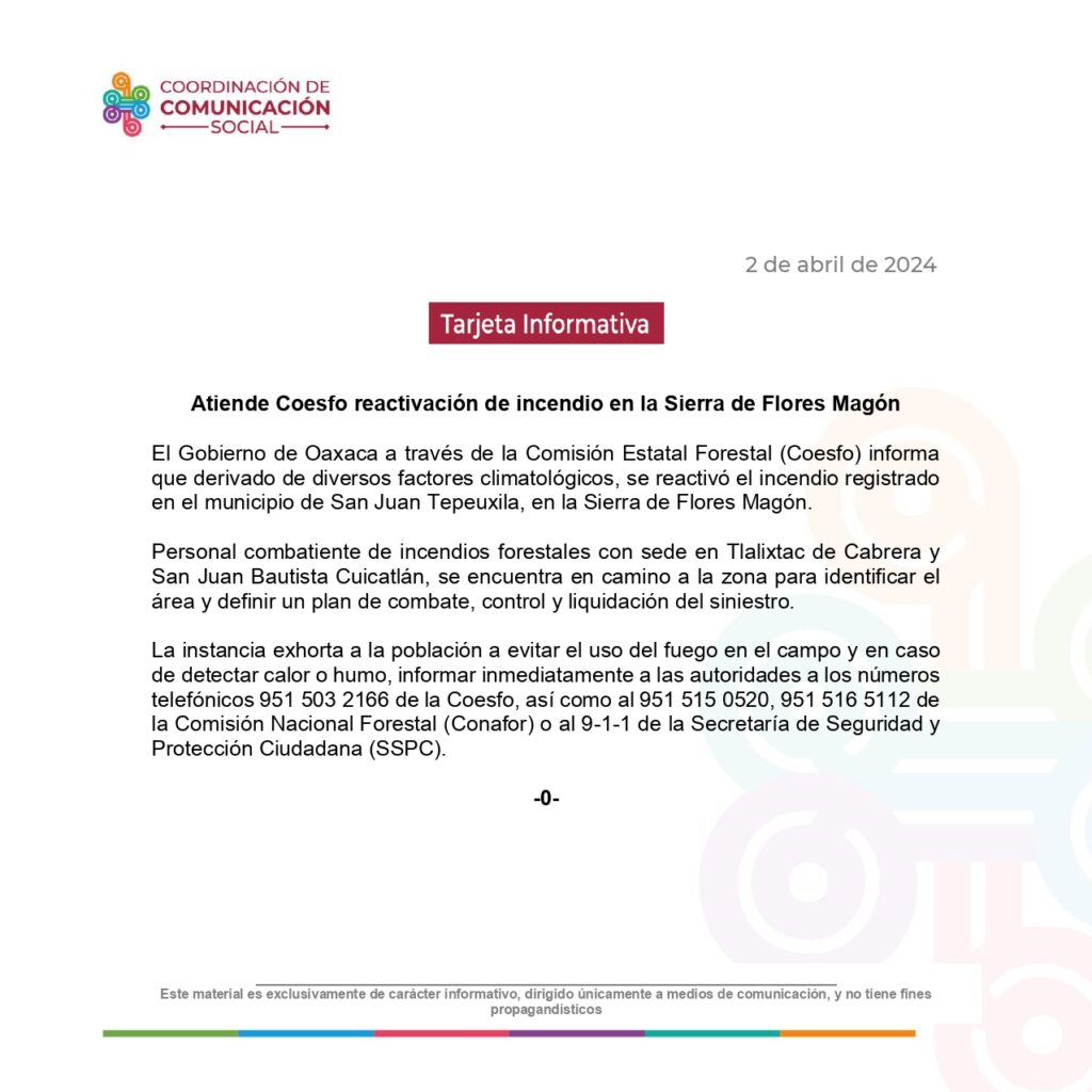 El Gobierno de Oaxaca a través de la Comisión Estatal Forestal (Coesfo) informa que derivado de diversos factores climatológicos, se reactivó el incendio registrado en el municipio de San Juan Tepeuxila, en la Sierra de Flores Magón.