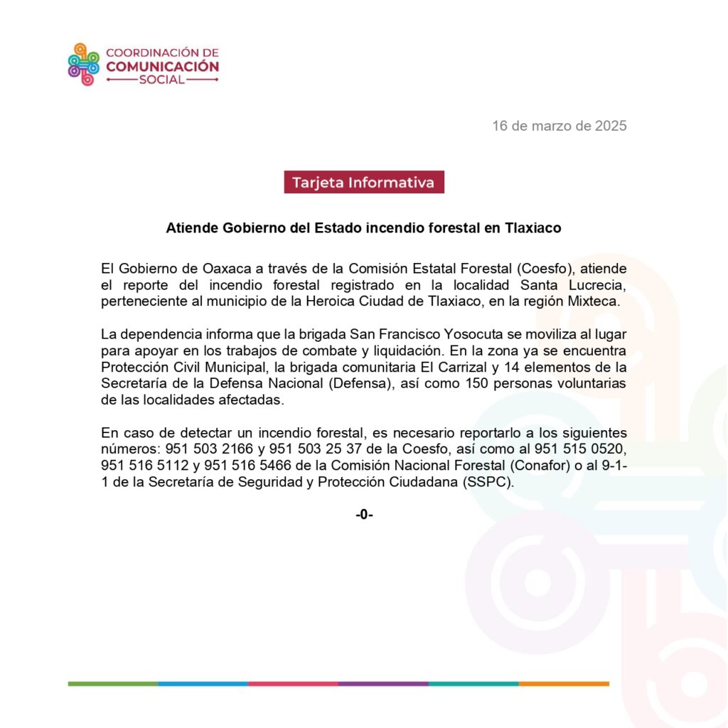 La dependencia informa que la brigada San Francisco Yosocuta se moviliza al lugar para apoyar en los trabajos de combate y liquidación. En la zona ya se encuentra Protección Civil Municipal, la brigada comunitaria El Carrizal y 14 elementos de la Secretaría de la Defensa Nacional (Defensa), así como 150 personas voluntarias de las localidades afectadas.