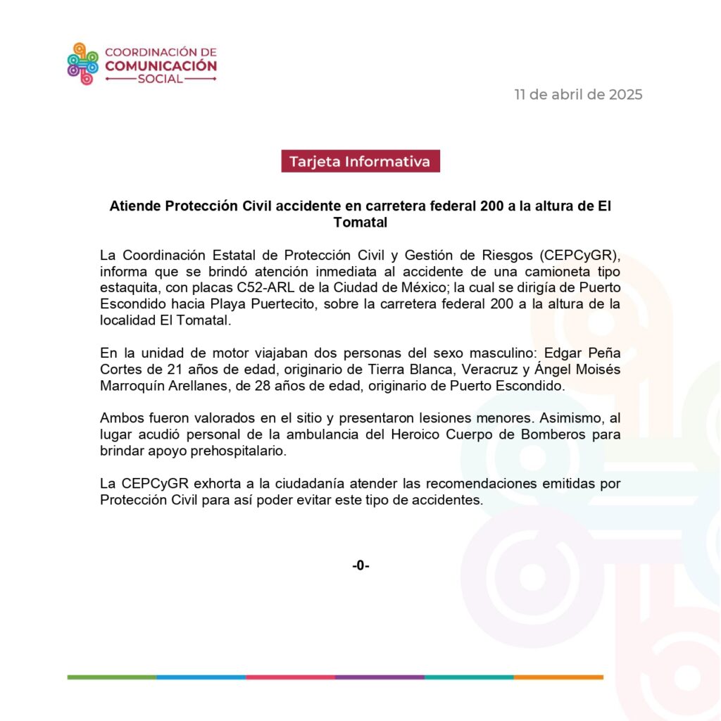 La Coordinación Estatal de Protección Civil y Gestión de Riesgos (CEPCyGR), informa que se brindó atención inmediata al accidente de una camioneta tipo estaquita, con placas C52-ARL de la Ciudad de México; la cual se dirigía de Puerto Escondido hacia Playa Puertecito, sobre la carretera federal 200 a la altura de la localidad El Tomatal.