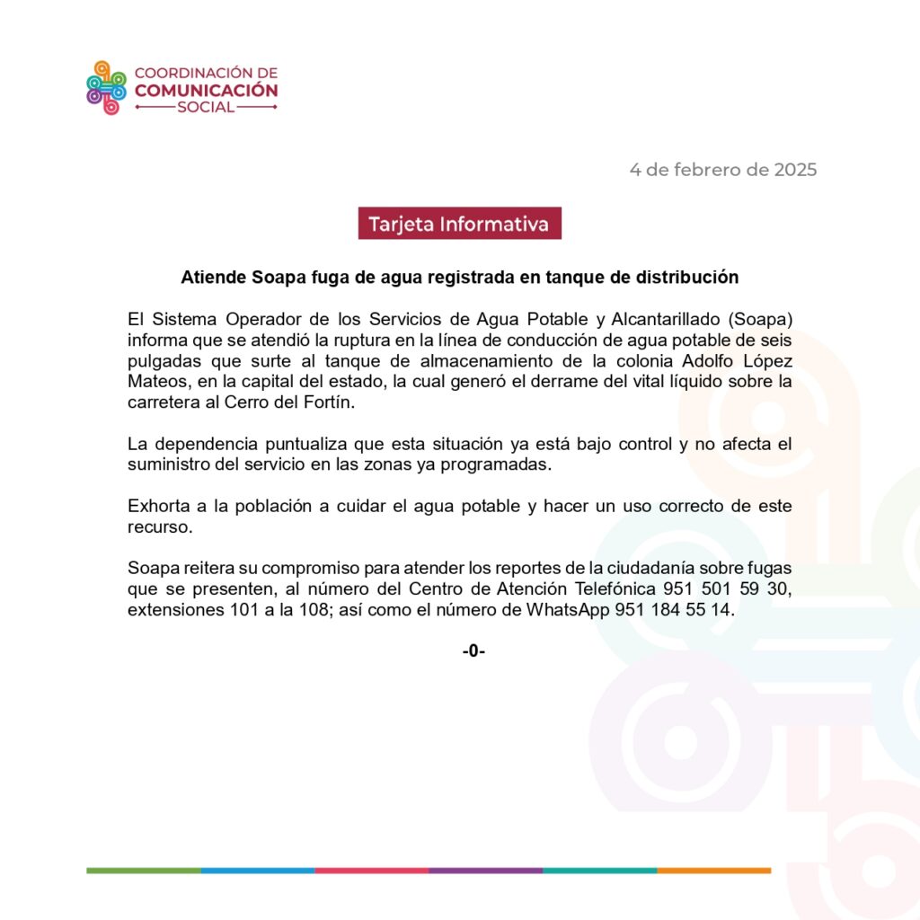Soapa reitera su compromiso para atender los reportes de la ciudadanía sobre fugas que se presenten, al número del Centro de Atención Telefónica 951 501 59 30, extensiones 101 a la 108; así como el número de WhatsApp 951 184 55 14.