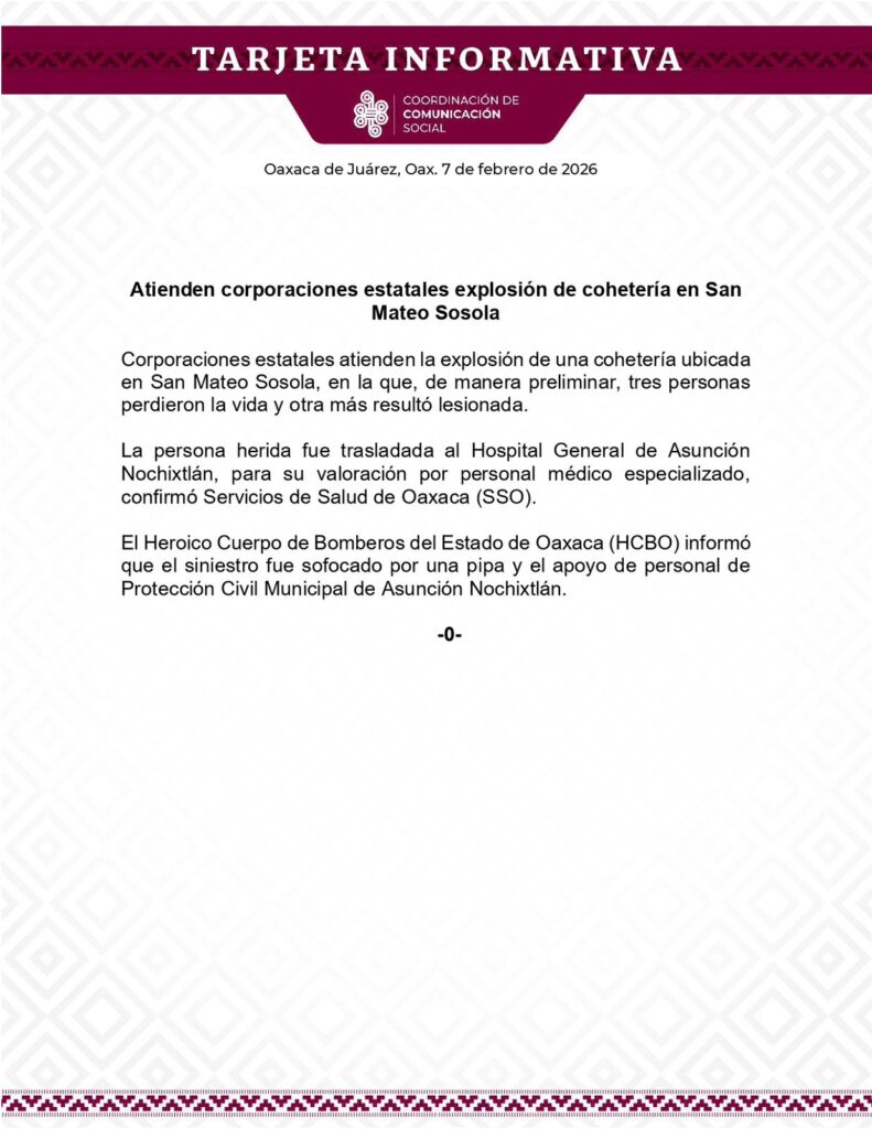 Corporaciones estatales atienden la explosión de una cohetería ubicada en San Mateo Sosola, en la que, de manera preliminar, tres personas perdieron la vida y otra más resultó lesionada.