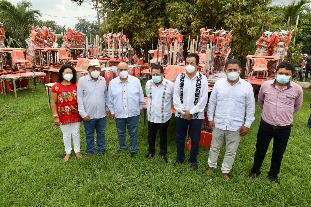 - En Loma Bonita, el director general Francisco Ángel Villarreal, entregó mobiliario escolar en beneficio de nueve mil 32 alumnos y 508 docentes de 71 escuelas