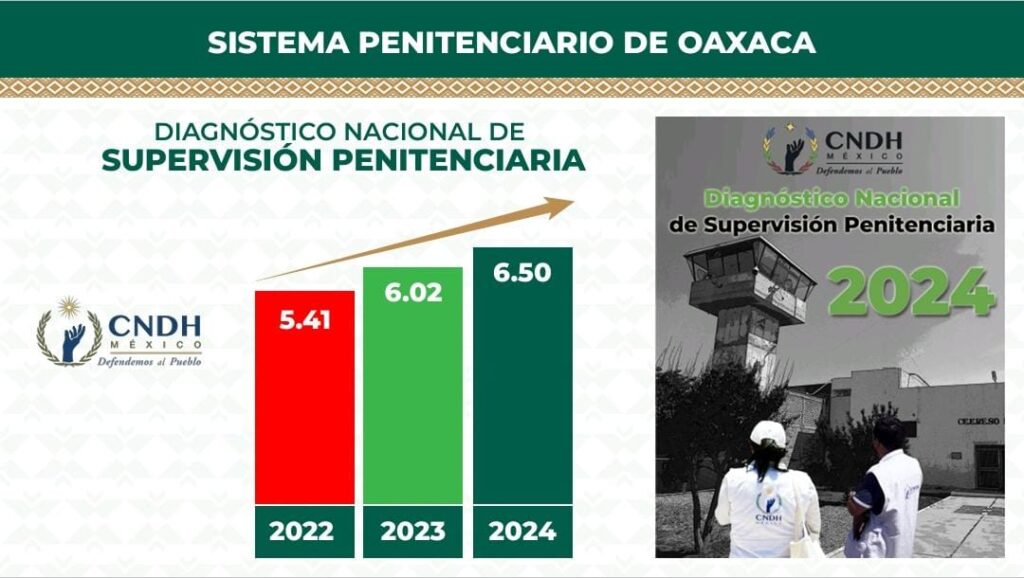 Esto refleja una tendencia al alza en los resultados de las evaluaciones realizadas por la CNDH en los Centros de Reinserción Social número 7 Tehuantepec, Femenil Tanivet, número 10 Juquila y el Especializado para Pacientes Psiquiátricos, así como, el Centro Penitenciario Varonil Tanivet.