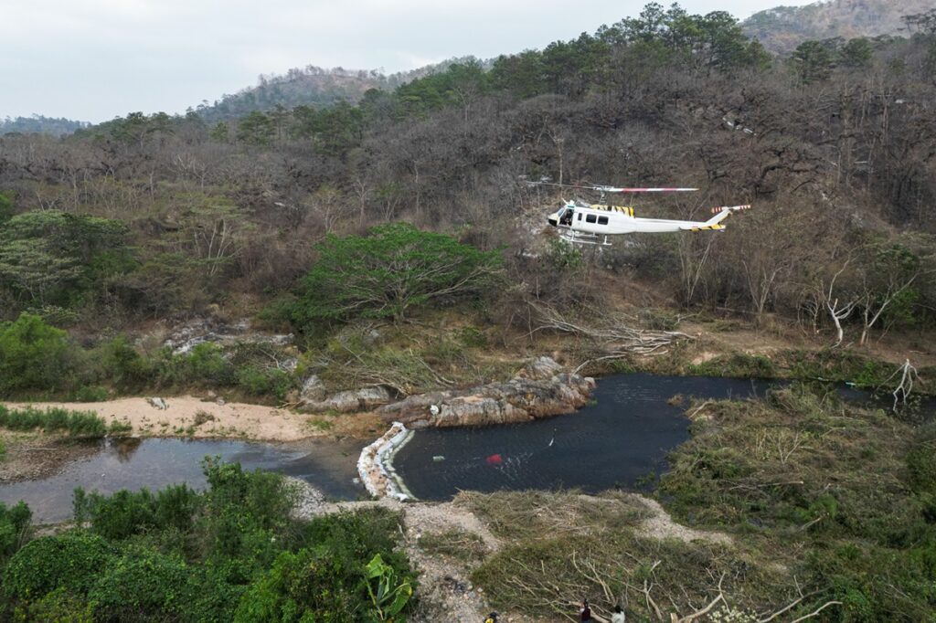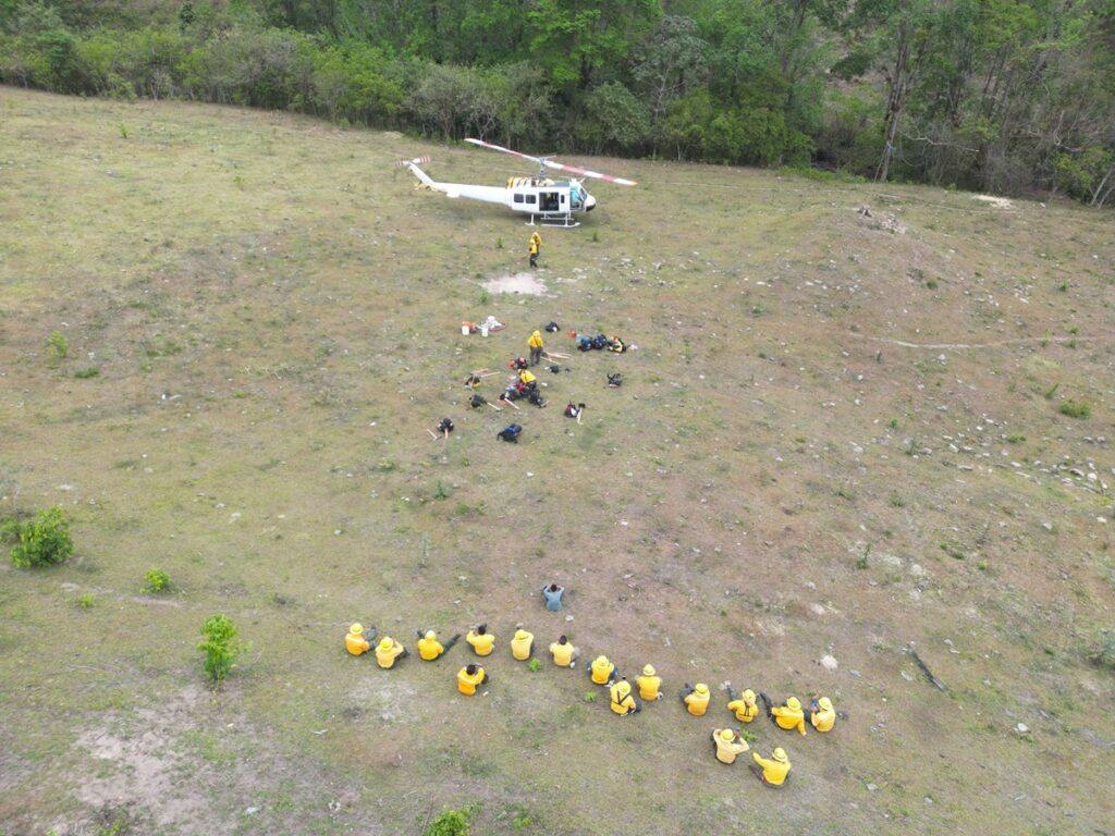 Vía aérea participa el helicóptero Bell UH-1H matrícula XA-UDZ para descargas de agua y traslado de equipo y brigadas.