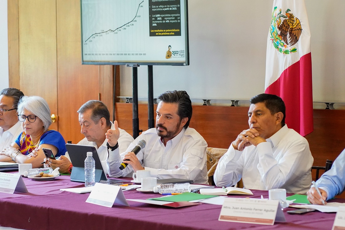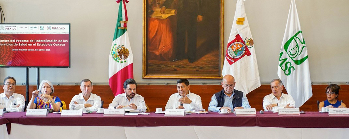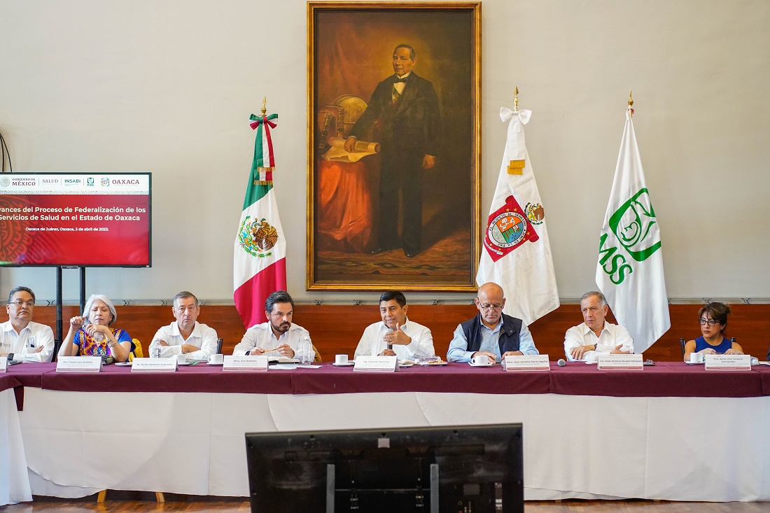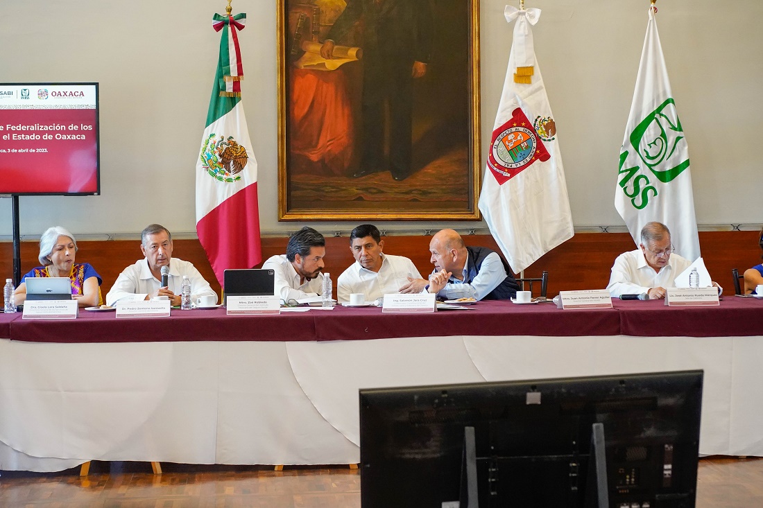 Oaxaca de Juárez, Oax, 03 de abril de 2023.- El Gobierno del Estado de Oaxaca y autoridades del Gobierno de México, representados por el gabinete de salud federal, llevaron a cabo una mesa de trabajo para analizar los avances en el proceso de federalización de los servicios de salud del estado, cobertura del personal médico, infraestructura y equipamiento, a fin de incorporar el Modelo de Atención de la Salud IMSS- Bienestar.