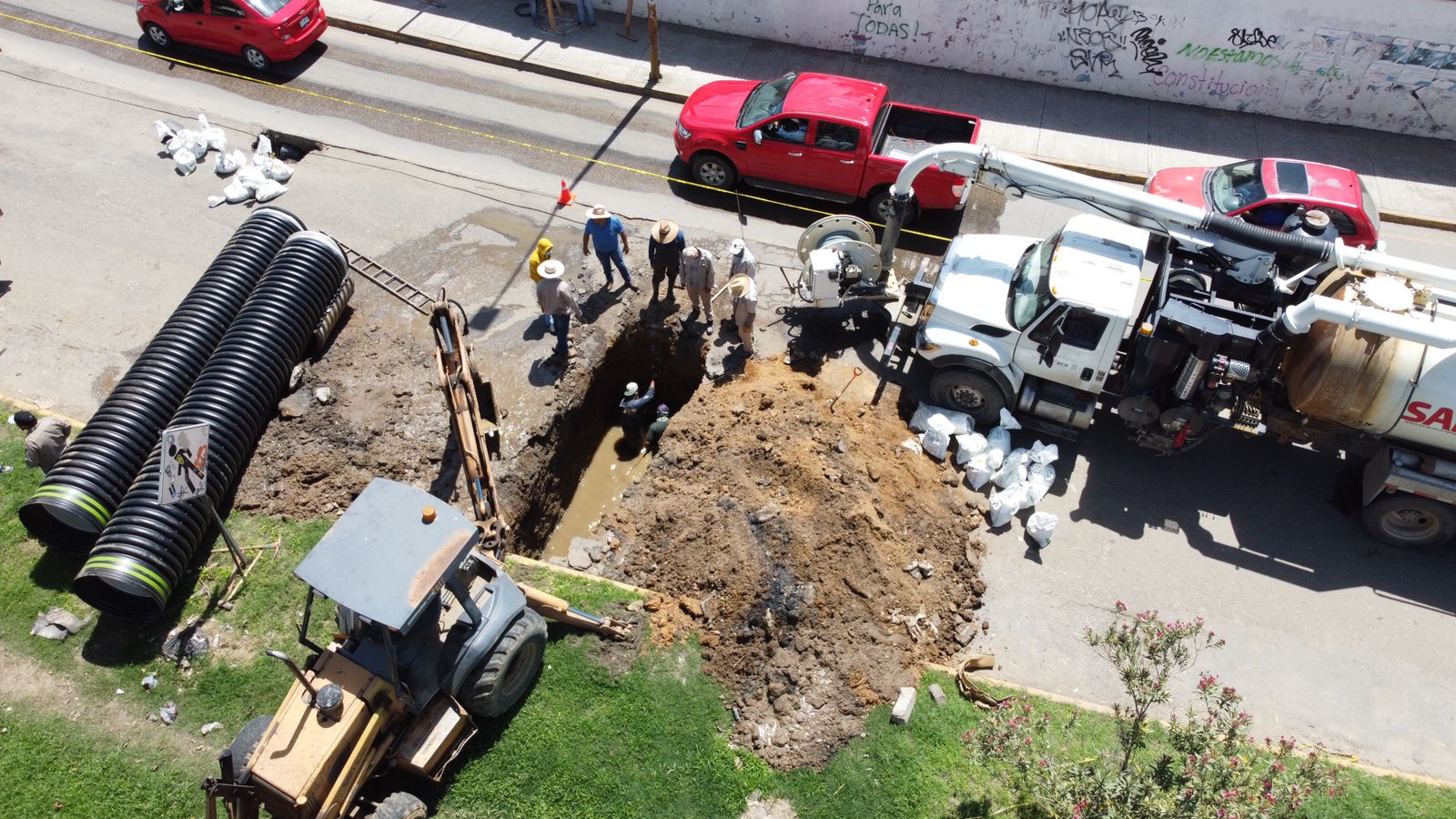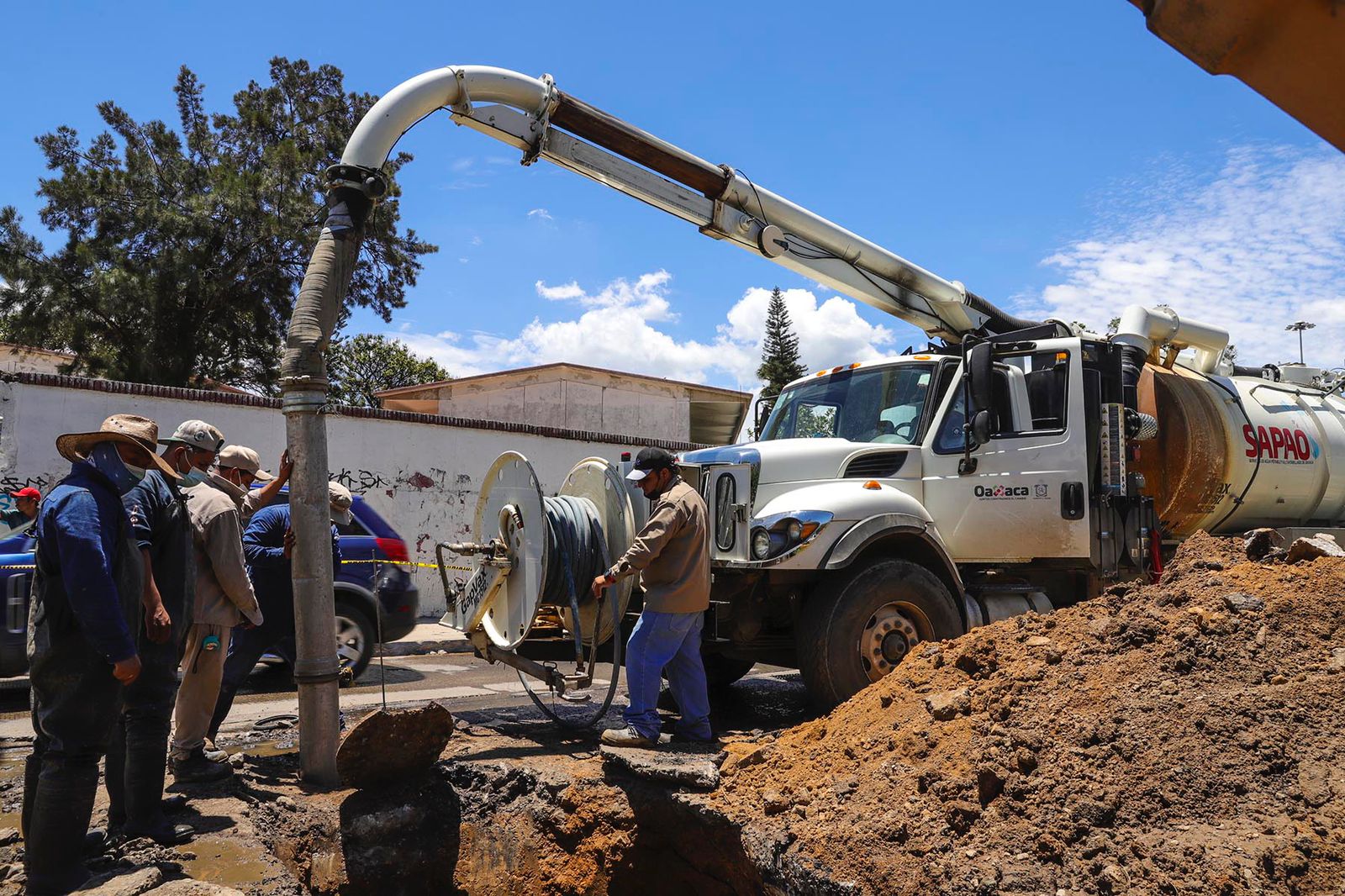 Subrayó que con el apoyo de los trabajadores que integran la Oficina de Alcantarillado, se realizaron las tareas de excavación del área a reparar, también se implementó el desazolve con el apoyo de equipo vactor, el cual es un sistema a presión que interviene el interior de la tubería para eliminar arenas, lodos y cualquier otro material.