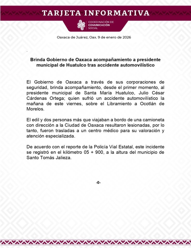 El Gobierno de Oaxaca a través de sus corporaciones de seguridad, brinda acompañamiento, desde el primer momento, al presidente municipal de Santa María Huatulco, Julio César Cárdenas Ortega; quien sufrió un accidente automovilístico la mañana de este viernes, sobre el Libramiento a Ocotlán de Morelos.