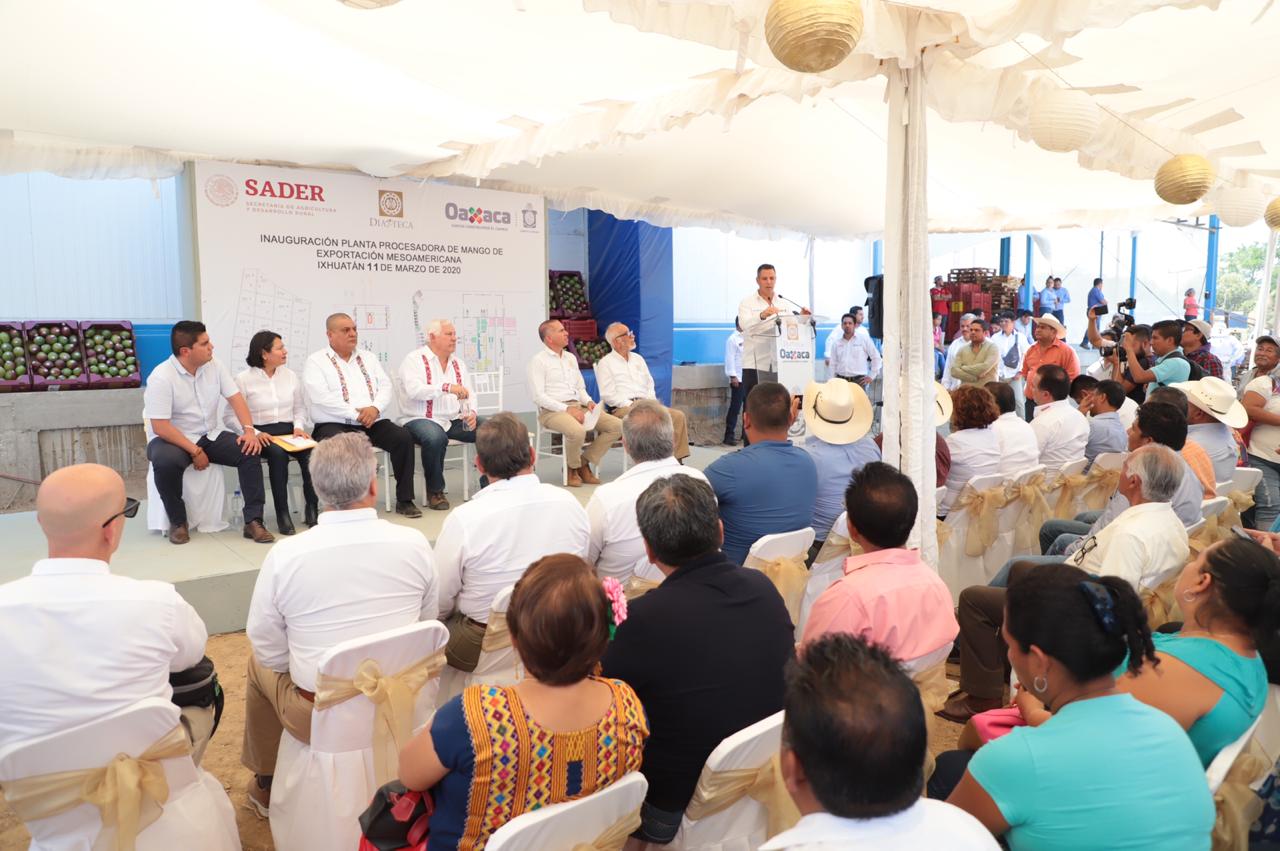 San Francisco Ixhuatán, Oax. 11 de marzo de 2020. Por el alto potencial agrícola, condiciones favorables para la inversión y la gobernabilidad de los que hoy goza el estado de Oaxaca, este municipio del Istmo de Tehuantepec fue elegido para la instalación de la Planta de Producción, Empacado y Comercialización de Mango Diazteca, que hoy inauguró el gobernador Alejandro Murat Hinojosa y en cual se generarán más de 600 empleos directos e indirectos a favor de las familias de la zona.