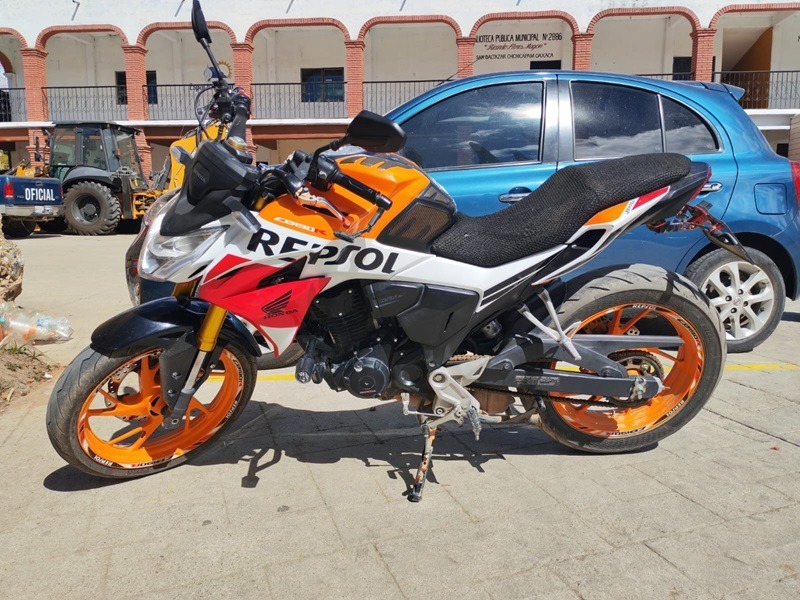 Asimismo, se logró la recuperación de una motocicleta marca Honda, color blanco con naranja, sin placas de circulación, la cual fue ubicada frente al parque municipal de San Baltazar Chichicápam, en el distrito de Ocotlán; la cual era operada por una persona con iniciales A.B.A., de 20 años.