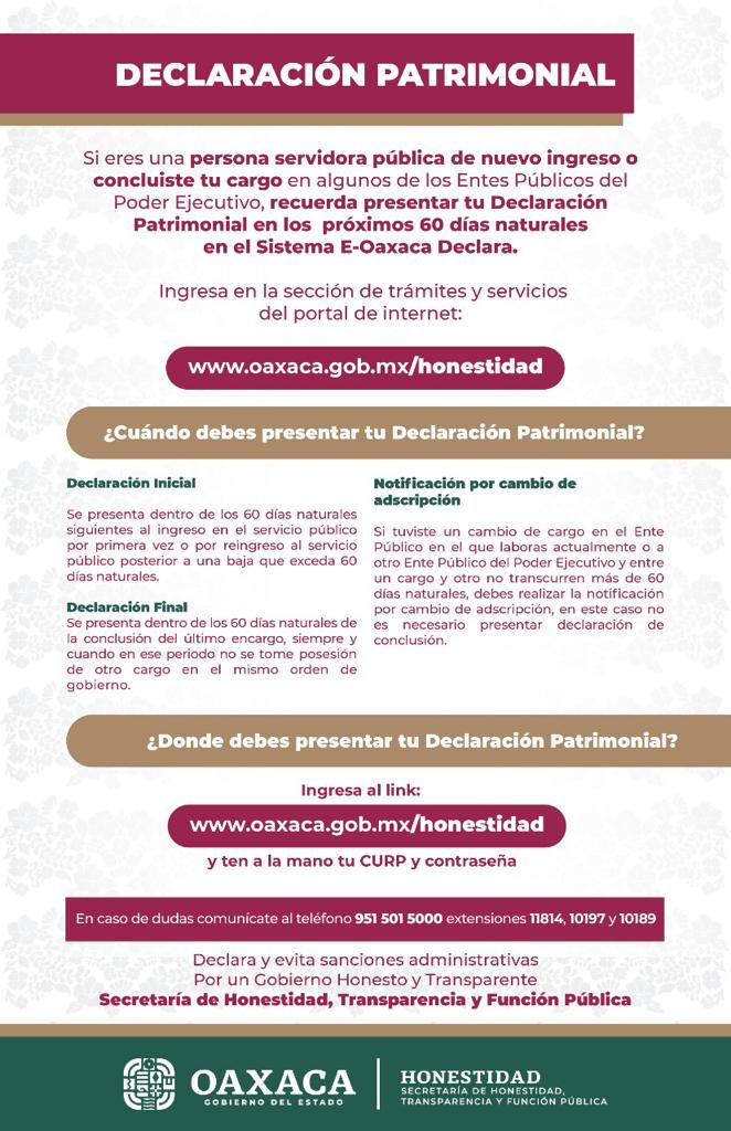 Para cumplir esta obligación -dijo- deberán realizarla en el “Sistema E-Oaxaca Declara”, ingresando en el apartado de trámites y servicios en la página oficial www.oaxaca.gob.mx/honestidad, en donde encontrarán disponibles los formatos completos y simplificados de las declaraciones.