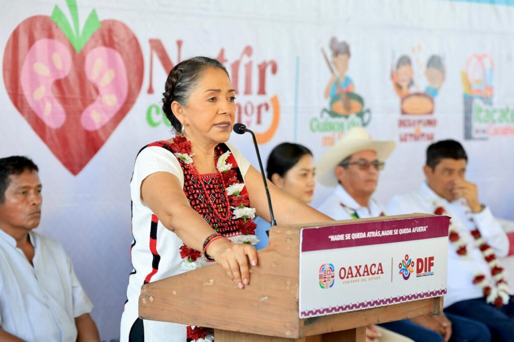 Desde la agencia de Nuevo Paso Nazareno, la Presidenta Honoraria del organismo, Irma Bolaños Quijano expresó junto al Gobernador Salomón Jara Cruz que con estos apoyos se garantiza en niñas, niños, mujeres y personas mayores, el acceso a alimentos nutritivos que favorecen su desarrollo físico y mental.
