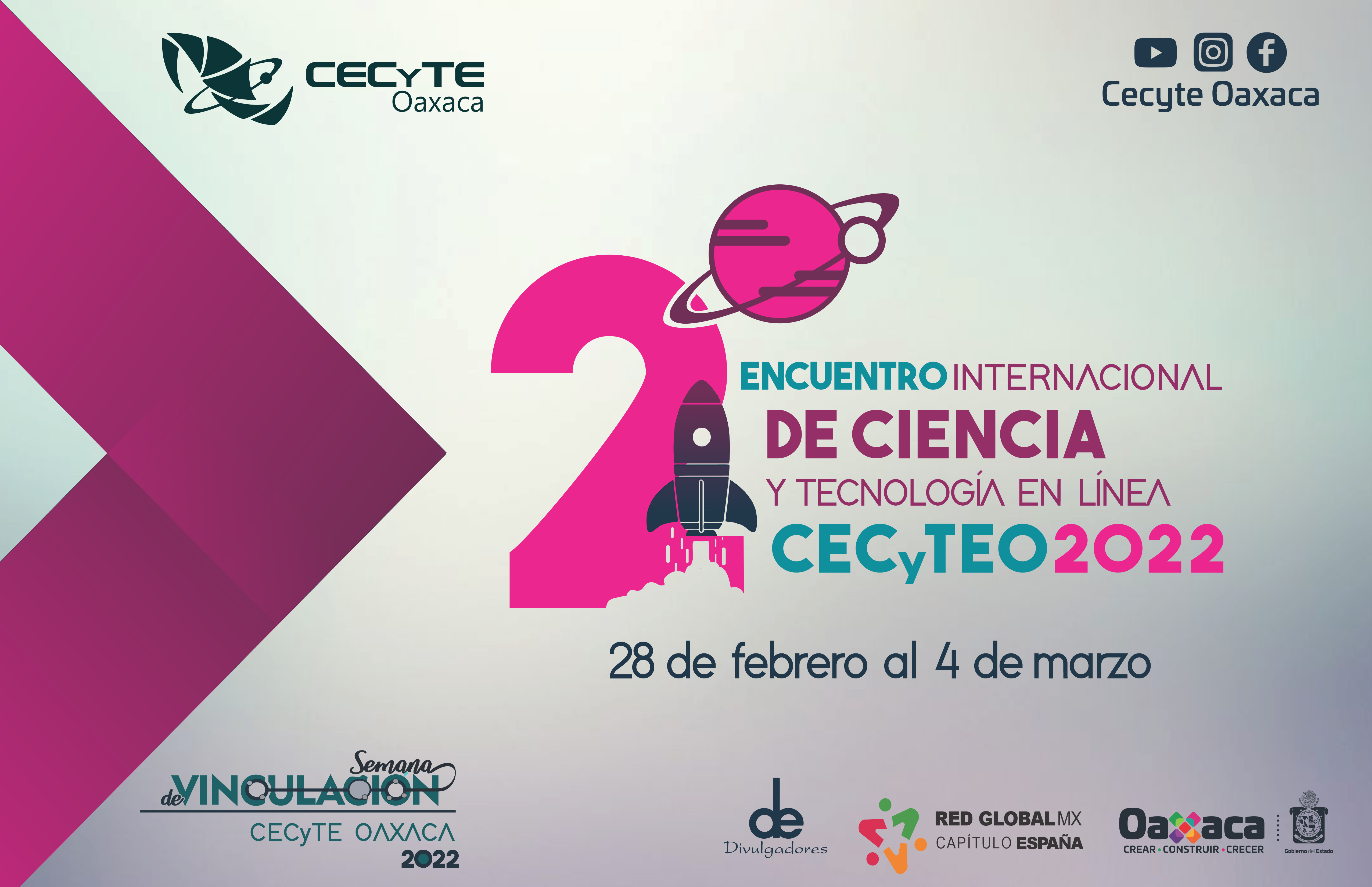 En la semana del 28 de febrero al 4 de marzo de este año, las y los más de 16 mil estudiantes del CECyTEO participarán de manera virtual en las 16 conferencias magistrales y 4 mesas de diálogo, donde se tiene confirmado a ponentes de la talla del Dr. Antonio Lazcano, profesor Emérito de la UNAM y quien ha presidido en dos ocasiones la International Society of the Study of the Origins of Life; la Dra. Julieta Fierro, que fue presidenta de la Comisión de Enseñanza de la Astronomía de la Unión Astronómica Internacional y ganadora del Premio Kalinga de la UNESCO; la Dra. Julia Tagüeña, quien recibió recientemente el Premio The Public Understanding and Popularization of Science Award 2021, de la Academia Mundial de las Ciencias.