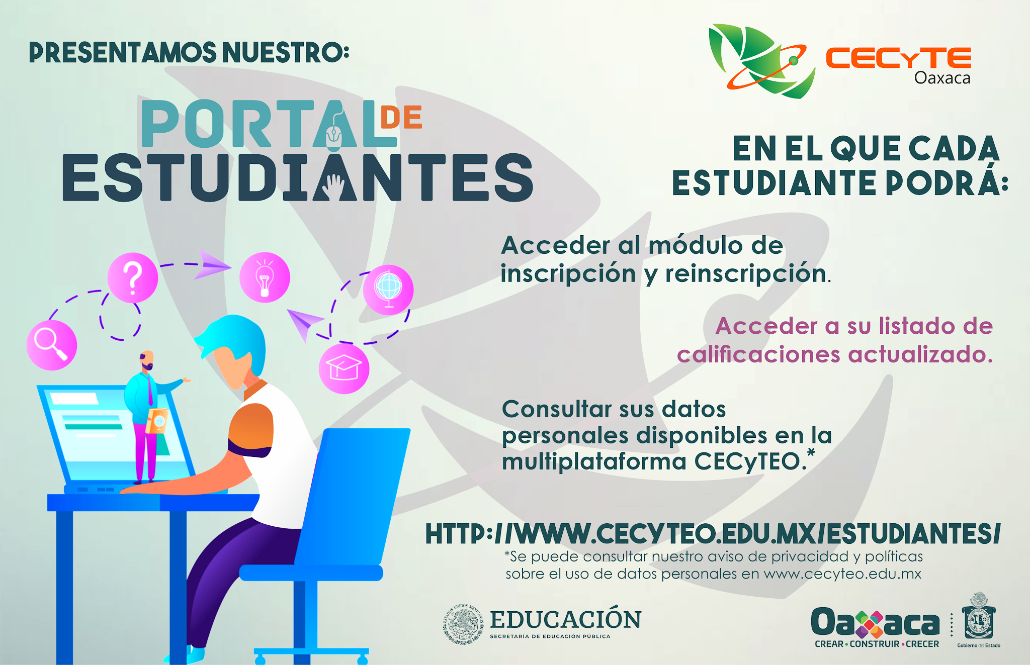 Oaxaca de Juárez, Oax. 28 de enero de 2021.- El Colegio de Estudios Científicos y Tecnológicos del Estado de Oaxaca (CECyTEO) informó la puesta en marcha de un portal especialmente diseñado para su comunidad estudiantil, un servicio en línea de vanguardia con el que este subsistema se sigue fortaleciendo y adaptándose a las nuevas condiciones de educación en tiempos de pandemia; el cual, permitirá realizar a distancia trámites que anteriormente se efectuaban de manera presencial.