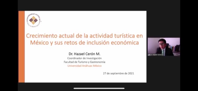 Para hablar de la recuperación de la actividad turística en el país, participó el coordinador del Centro Anáhuac de Investigación en Turismo, Hazael Cerón Monroy con la conferencia, «Crecimiento actual de la actividad turística en México y sus retos de inclusión económica».