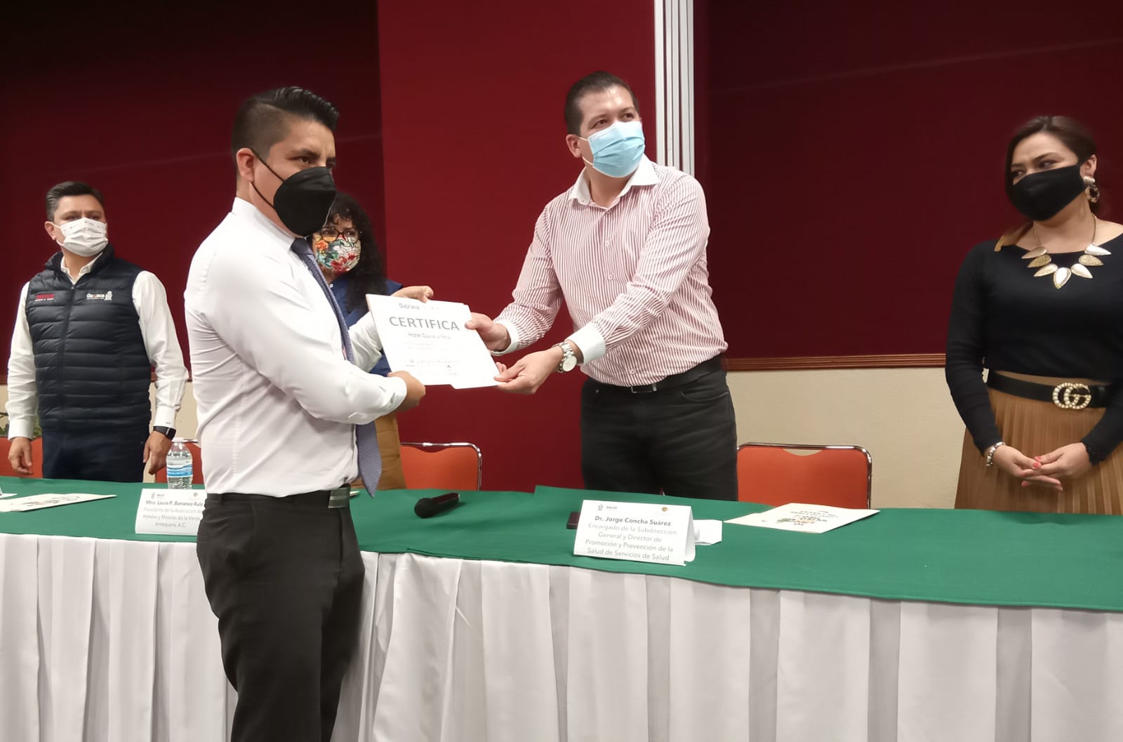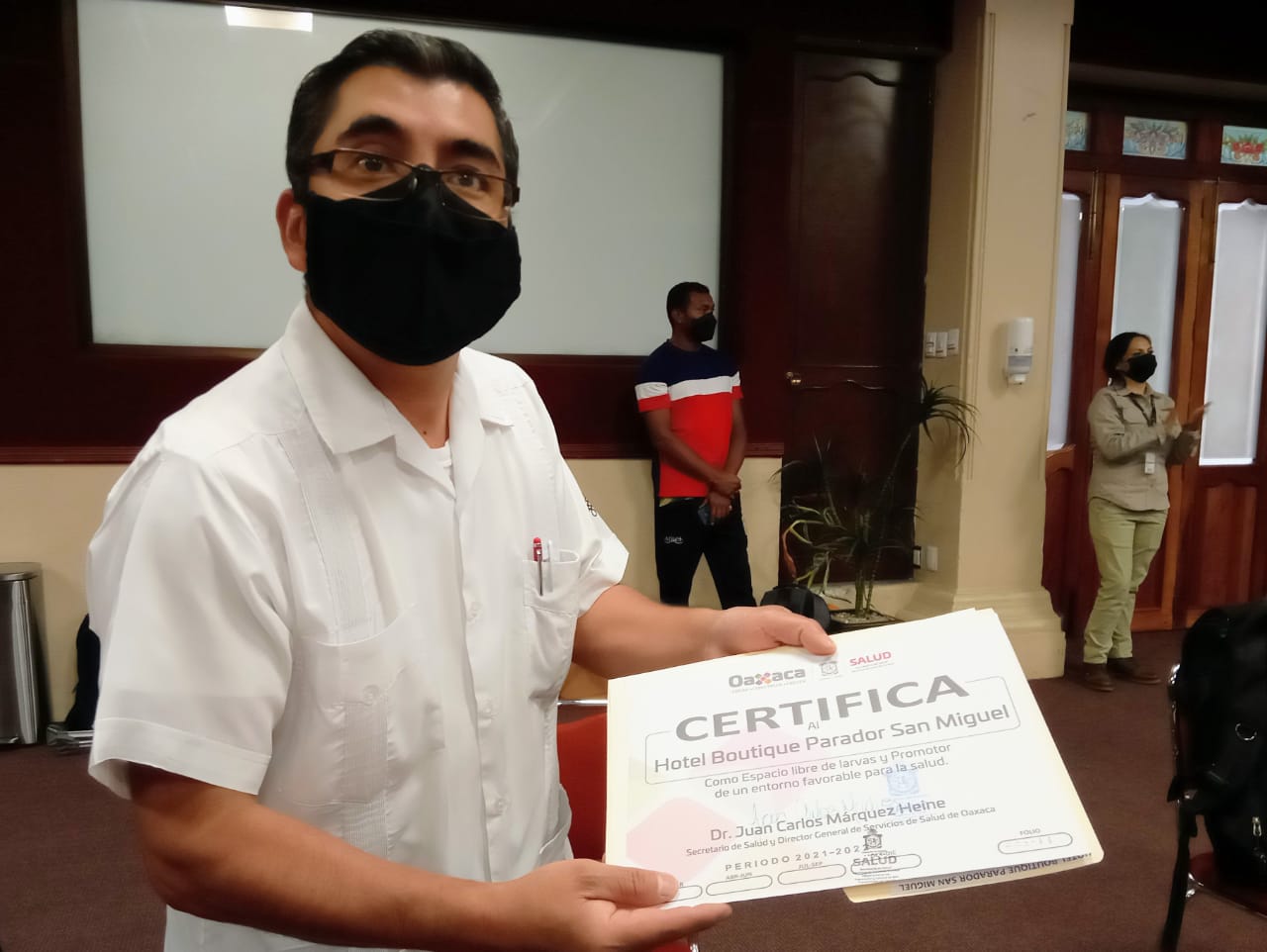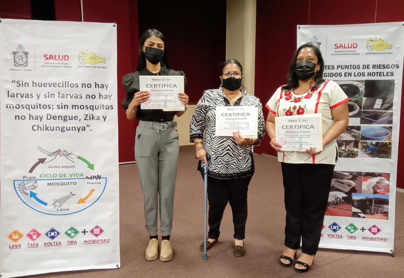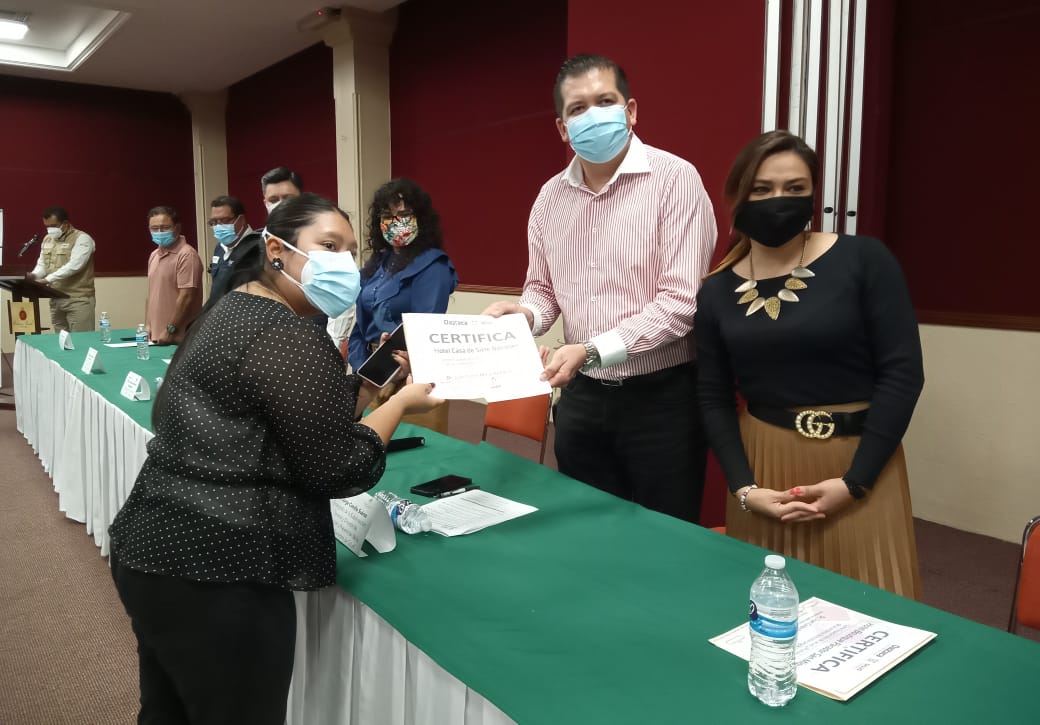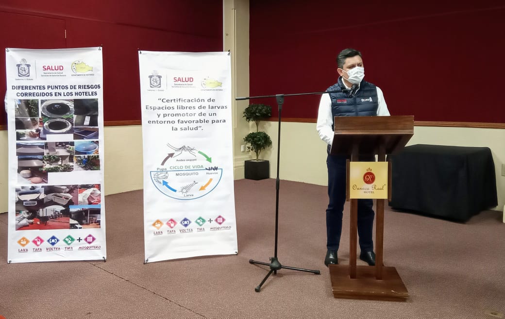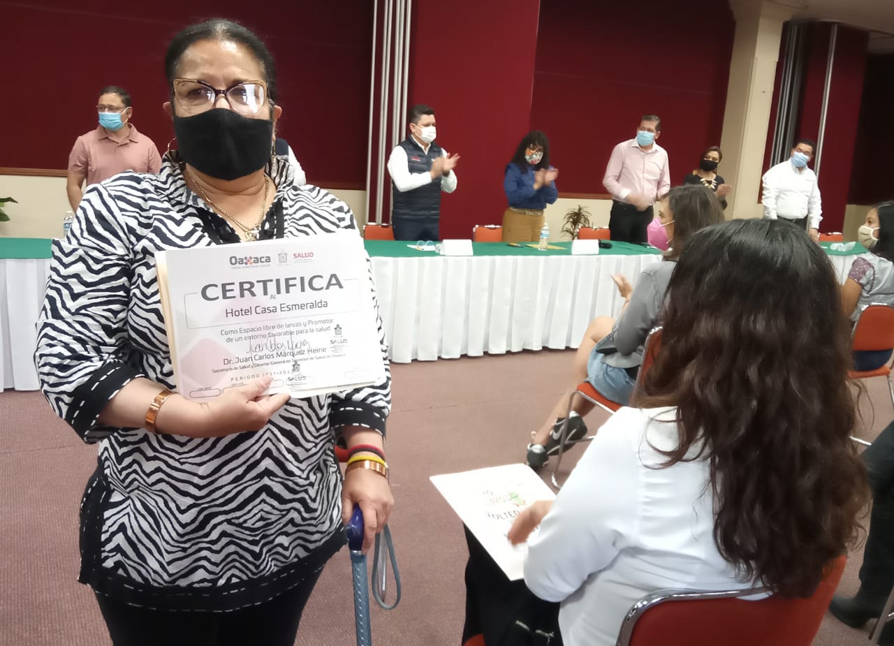 Oaxaca de Juárez, Oax. 29 de noviembre de 2021.- Los Servicios de Salud de Oaxaca (SSO) certificaron a 13 hoteles adheridos a la Asociación de Hoteles y Moteles de la Verde Antequera (AHMVA) A.C, como “Establecimientos libres de larvas del mosquito Aedes aegypti y promotores de entornos favorables para la salud”.