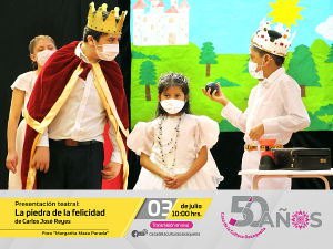La puesta en escena “La piedra de la felicidad” será presentada por el grupo representativo de teatro de la institución “Guel Navany”, esta agrupación se creó por Rocío Pacheco en el año 2004, originalmente con el nombre de Los Pinochos, actualmente es dirigido por el tallerista de la CCO, Hassael Tejada Hernández.