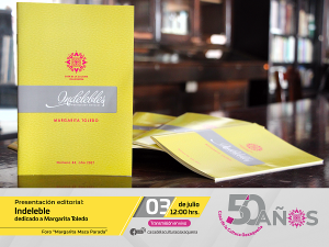 Posteriormente se llevará a cabo la presentación editorial del “Indeleble” que, para este aniversario, está dedicado a Margarita Toledo. Esta publicación es un proyecto institucional de la Casa de la Cultura Oaxaqueña que destaca la vida y obra de diversos personajes oaxaqueños.