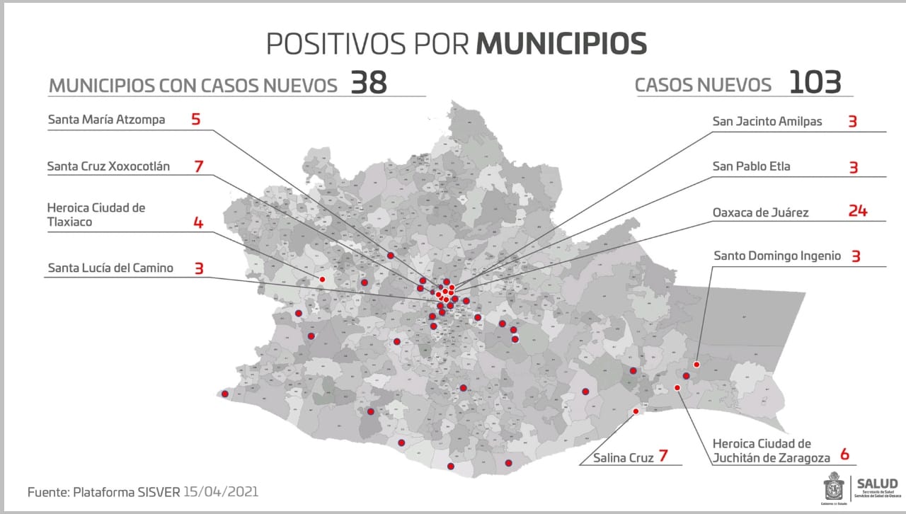Señaló que los 103 casos nuevos se ubican en 38 municipios, siendo los que mayor número de casos presentan: Oaxaca de Juárez con 24, Santa Cruz Xoxocotlán y Salina Cruz siete cada uno, Juchitán de Zaragoza seis, Santa María Atzompa cinco, Tlaxiaco cuatro, el resto tres, dos y un caso.
