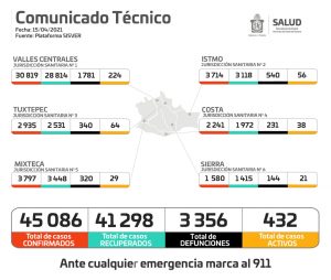Oaxaca de Juárez, Oax. 15 de abril de 2021.- Los Servicios de Salud de Oaxaca (SSO), informan que al corte de este jueves 15 de abril, se han registrado 103 casos nuevos de COVID-19, que suman 45 mil 086 acumulados en toda la entidad.