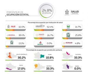Dijo que en relación a la ocupación hospitalaria, por Jurisdicciones Sanitarias Valles Centrales cuenta con un 30.2%, Istmo 10.8%, Tuxtepec 33.3%, Costa 17%, Mixteca 33.3% y la Sierra 0%, haciendo un global del 24.8%, con 15 nuevos hospitalizados, hay 4 hospitales al 100%.