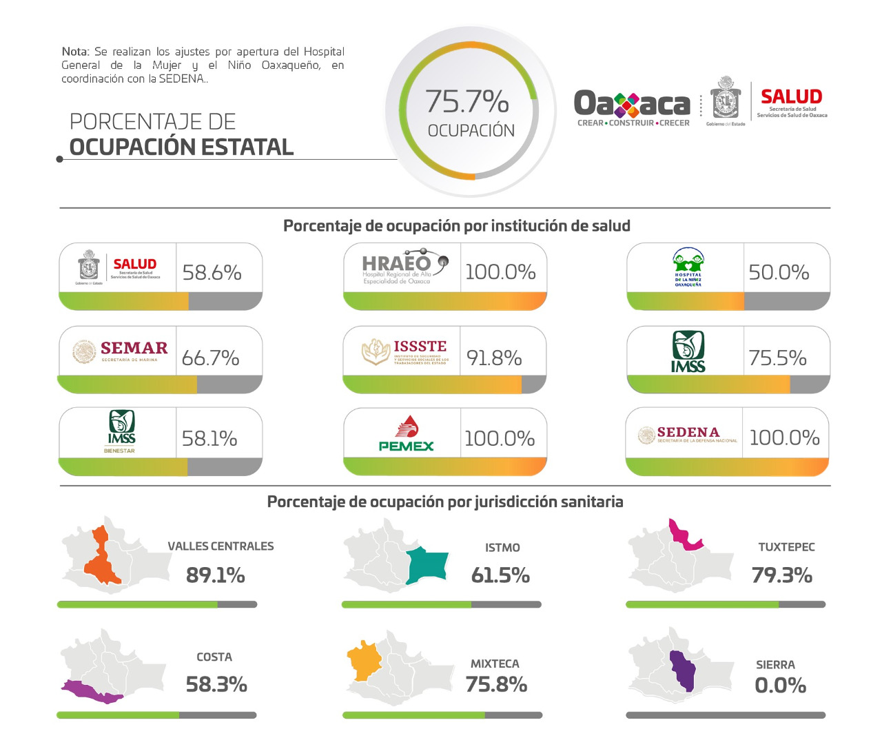 Por Jurisdicción Sanitaria, los hospitales que se ubican en Valles Centrales trabajan al 89.1% de su capacidad, seguido de los nosocomios de Tuxtepec, quienes reportan el 79.3%, la Mixteca con el 75.8%, el Istmo con el 61.5%, Costa con el 58.3% y la Sierra con 0%.