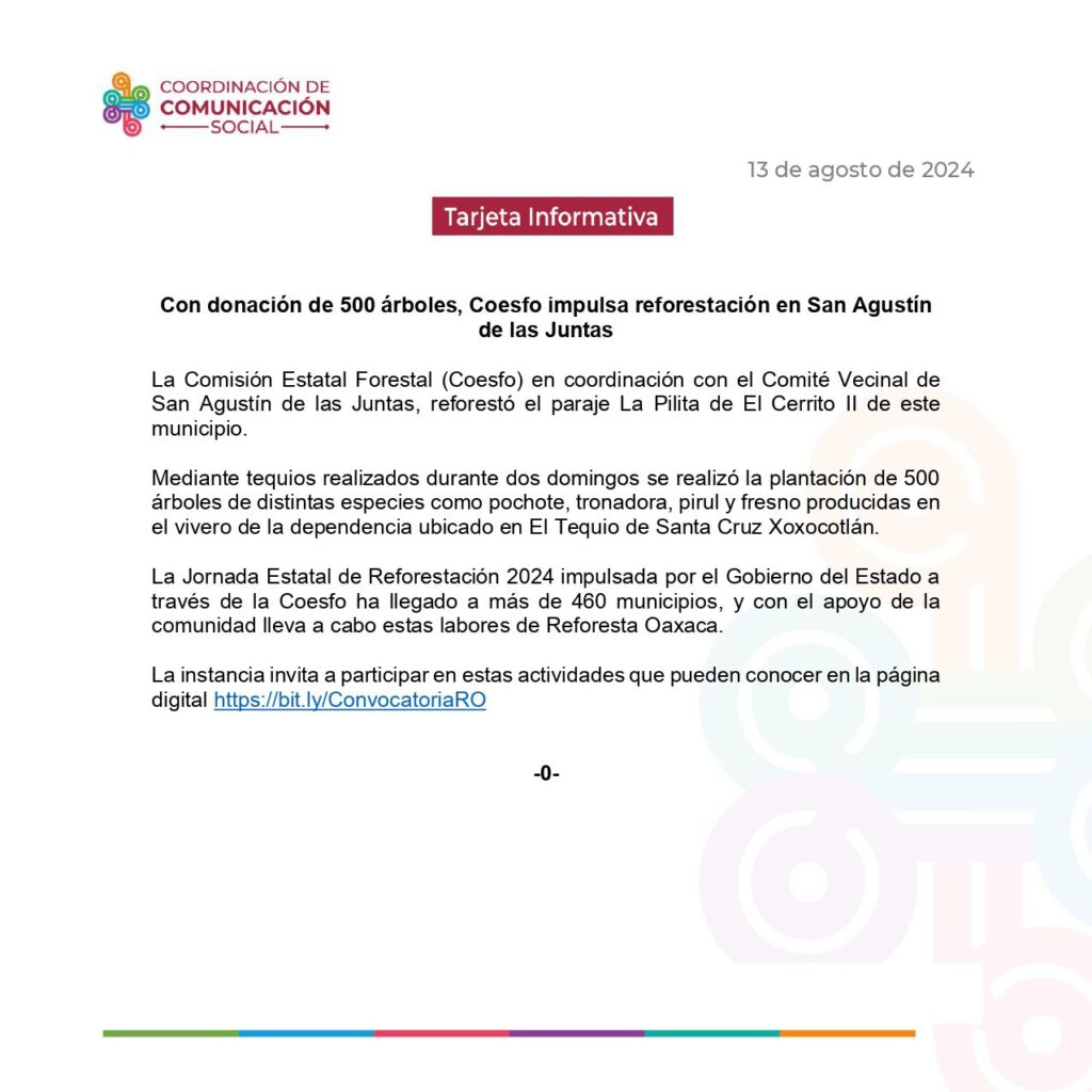 La Jornada Estatal de Reforestación 2024 impulsada por el Gobierno del Estado a través de la Coesfo ha llegado a más de 460 municipios, y con el apoyo de la comunidad lleva a cabo estas labores de Reforesta Oaxaca.