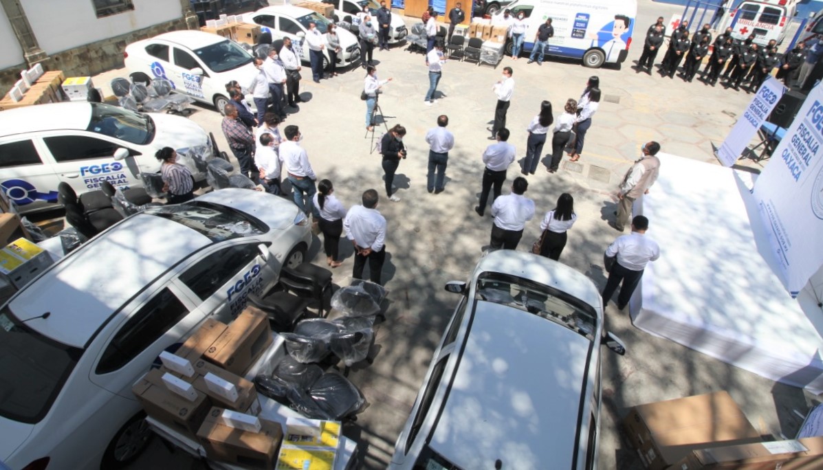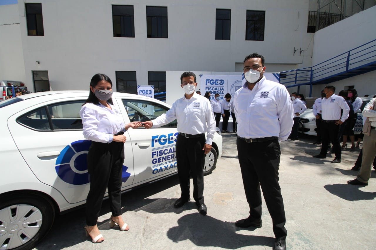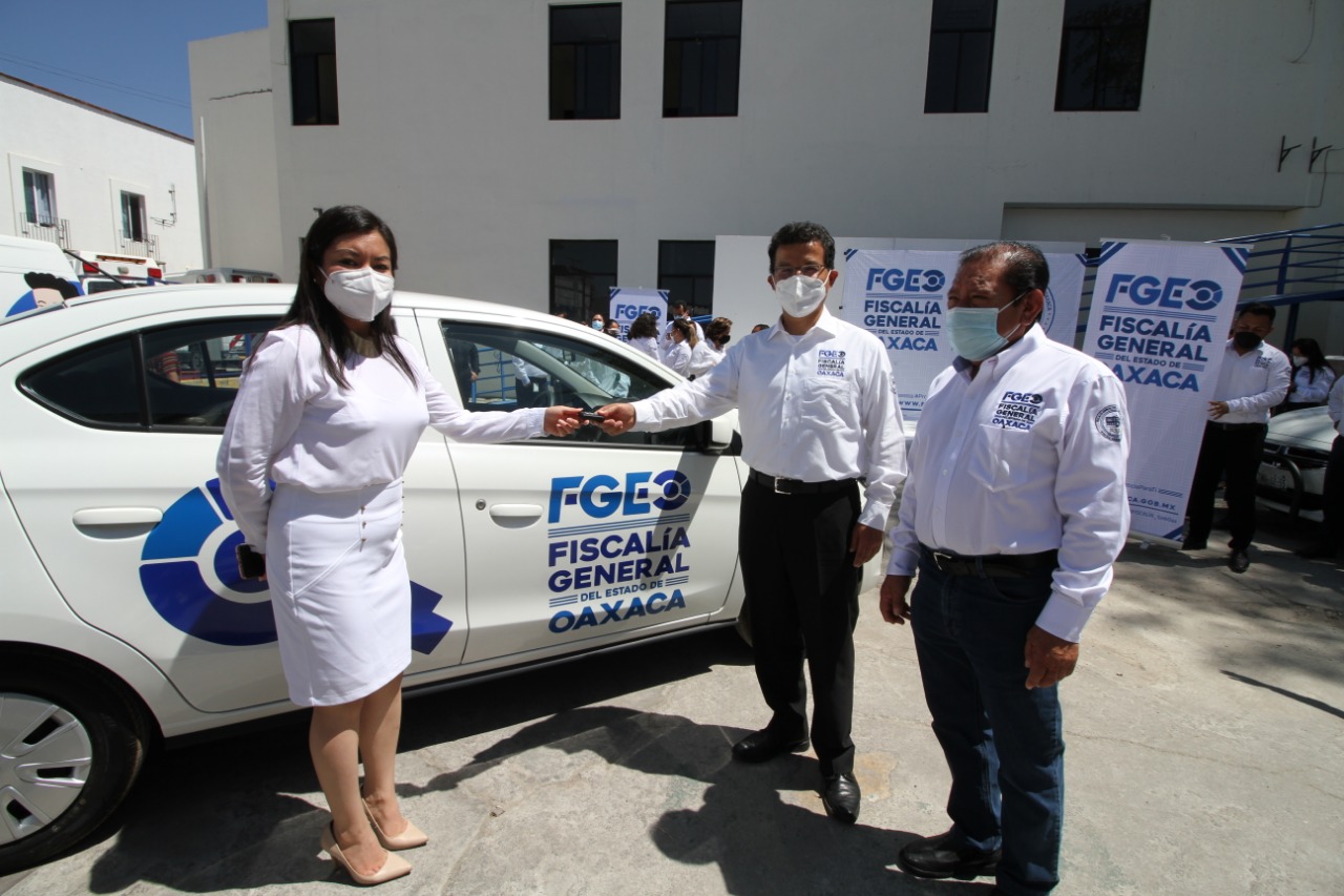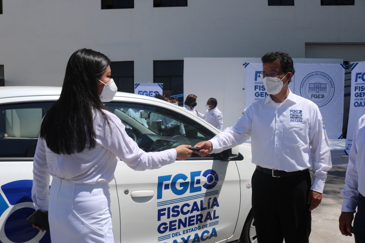 Oaxaca de Juárez, Oax., 4 de marzo de 2021.- En el marco del Día Internacional de la Mujer –a conmemorarse el próximo 8 de marzo- el Fiscal General, Rubén Vasconcelos Méndez, realizó la entrega de vehículos, mobiliario y equipo de cómputo a las coordinadoras de la 6 Unidades de investigación de delitos cometidos contra mujeres y niñas, niños y adolescentes.