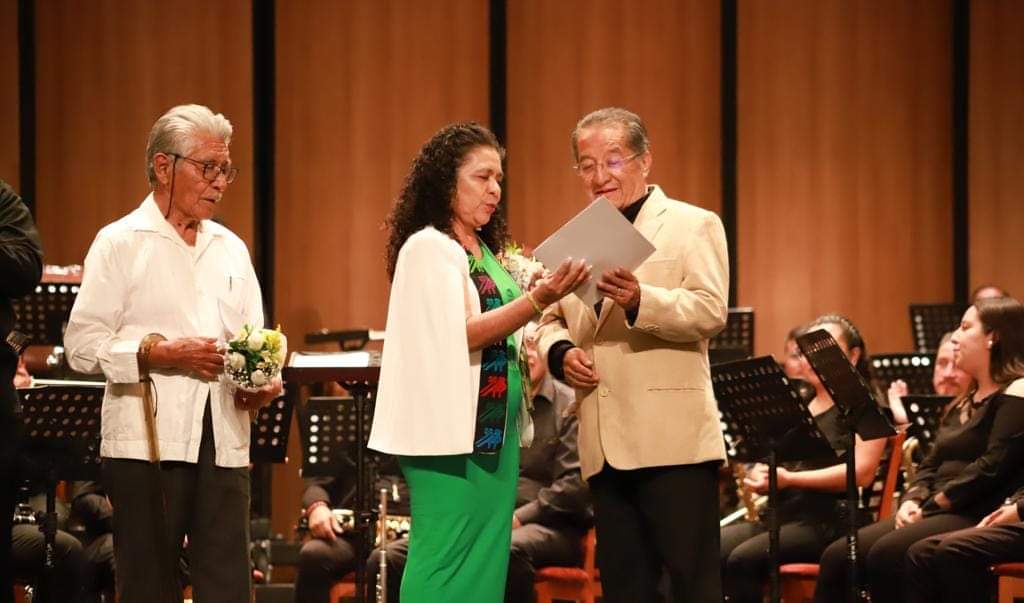 Durante este concierto, el funcionario estatal y la secretaria del Trabajo, Edith Santibáñez Bohórquez, entregaron reconocimientos a quienes fueron directores de esta Banda de Música del Estado.