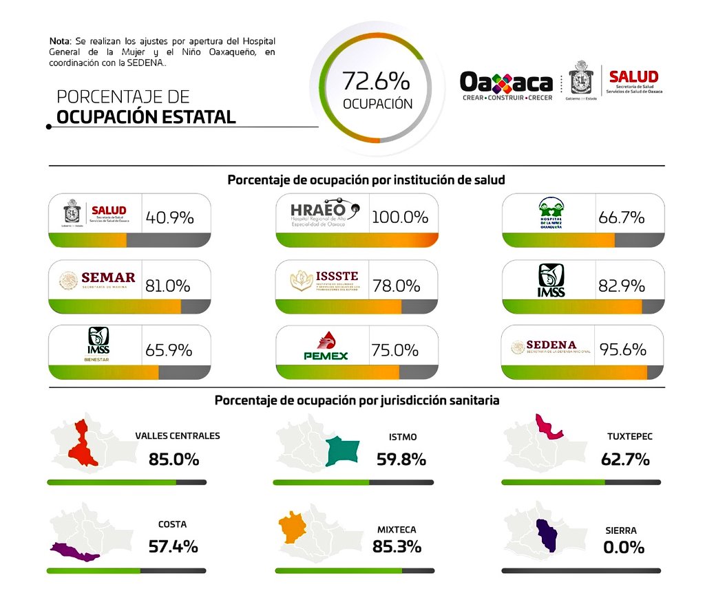 Subrayó que en las últimas 24 horas se hospitalizaron a 17 nuevos pacientes, hay 15 nosocomios con una ocupación del 100 por ciento, se cuenta con 135 camas disponibles de un total de 493; la Mixteca presentó una saturación del 85.3 por ciento, seguido de Valles Centrales con 85 por ciento, Tuxtepec con 62.7 por ciento, Istmo con 59.8 por ciento, Costa con 57.4 por ciento y Sierra 0 por ciento, para un total de 72.6 por ciento de ocupación general.