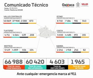 Según el informe de casos positivos, la dependencia resaltó que la Jurisdicción Sanitaria de Valles Centrales, reportó 40 mil 869 confirmados 873 activos y dos mil 088 decesos; Istmo ocho mil 710 casos, 543 activos y 981 muertes; Tuxtepec cuatro mil 711 positivos, 208 activos y 439 defunciones; Costa cinco mil 033 contagios, 155 activos y 393 fallecimientos; Mixteca cinco 419 casos, 104 activos y 456 muertes; Sierra dos mil 246 casos, 82 activos y 246 decesos.
