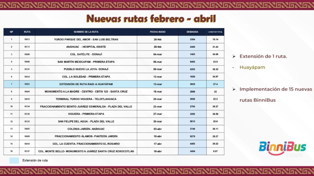 Por su parte, la directora general del BinniBus, Karina Gómez Esteban informó que la nueva ruta RA-02 “Mo” -que significa montaña en lengua chinanteca- cubrirá el trayecto de Santa María Atzompa al Ejido Guadalupe Victoria, Oaxaca de Juárez. Esta operará con seis unidades en circulación, en un horario de 6:00 a 22:00 horas.