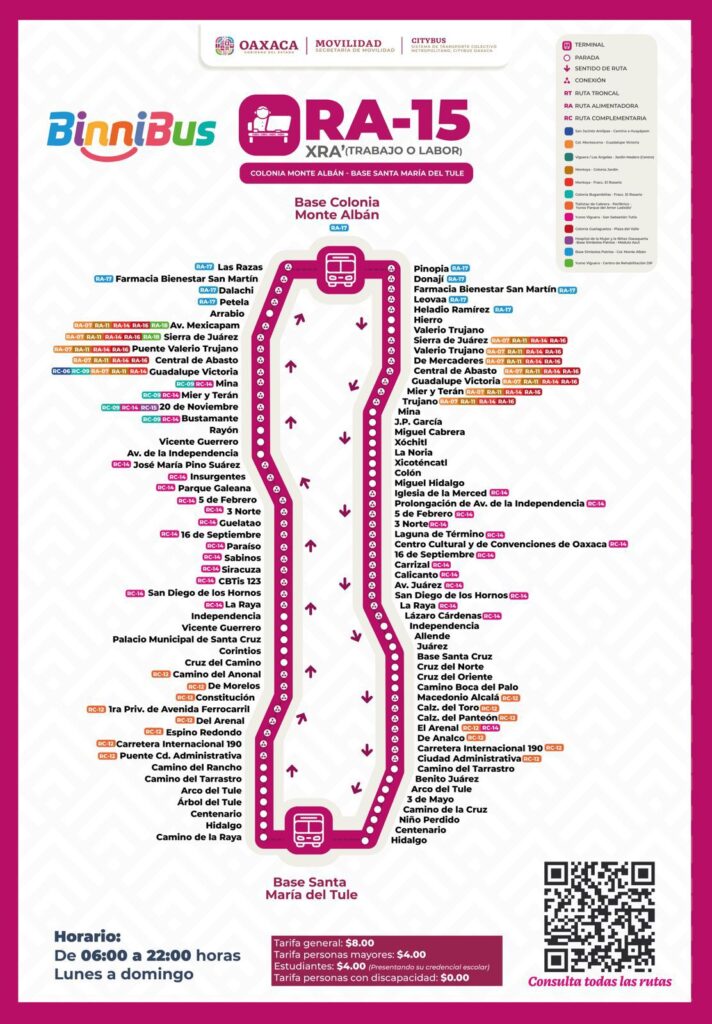 Esta ruta operará con ocho unidades, iniciando su recorrido en la colonia Monte Albán a las 6:00 horas y con primera salida desde Santa María del Tule a las 7:20 horas, concluyendo labores a las 22:00 horas.