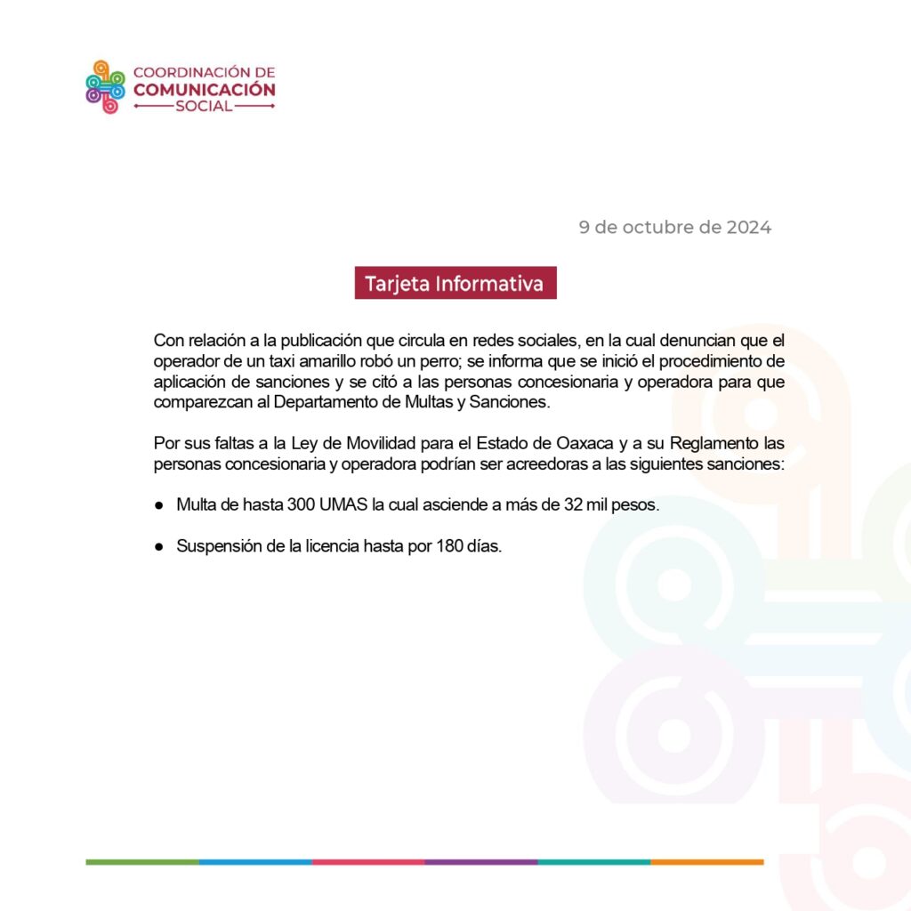 Con relación a la publicación que circula en redes sociales, en la cual denuncian que el operador de un taxi amarillo robó un perro