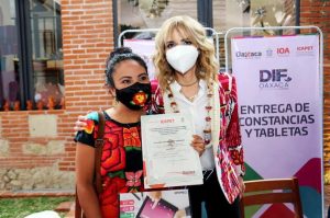 Oaxaca de Juárez, Oax. 14 de julio del 2021.- Con el objetivo de mejorar el servicio y atención al turismo nacional y extranjero, asimismo el de incrementar las ventas en los negocios locales de las y los oaxaqueños, la presidenta honoraria del Sistema para el Desarrollo Integral de la Familia (DIF) del Estado de Oaxaca, Ivette Morán de Murat, entregó constancias y tabletas a las y los maestros artesanos, que participaron y concluyeron los cursos de inglés, marketing y negociación, así como manejo de redes sociales.