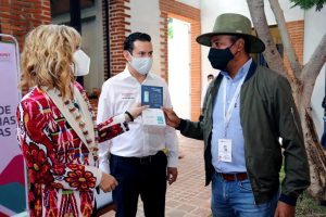 Posteriormente, Ivette Morán de Murat en compañía de Juan Pablo Guzmán Cobián, secretario de economía y Nadia Clímaco Ortega, directora general del Instituto Oaxaqueño de las Artesanías, entregaron terminales punto de venta a artesanas y artesanos, con el fin de facilitar el pago y comercio de las artesanías oaxaqueñas con tarjetas de crédito y débito.