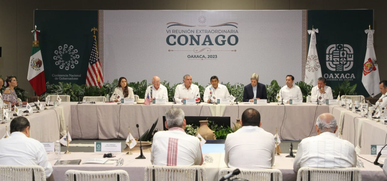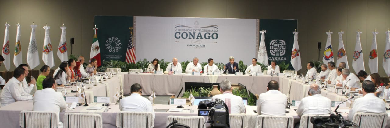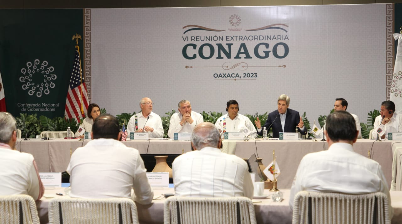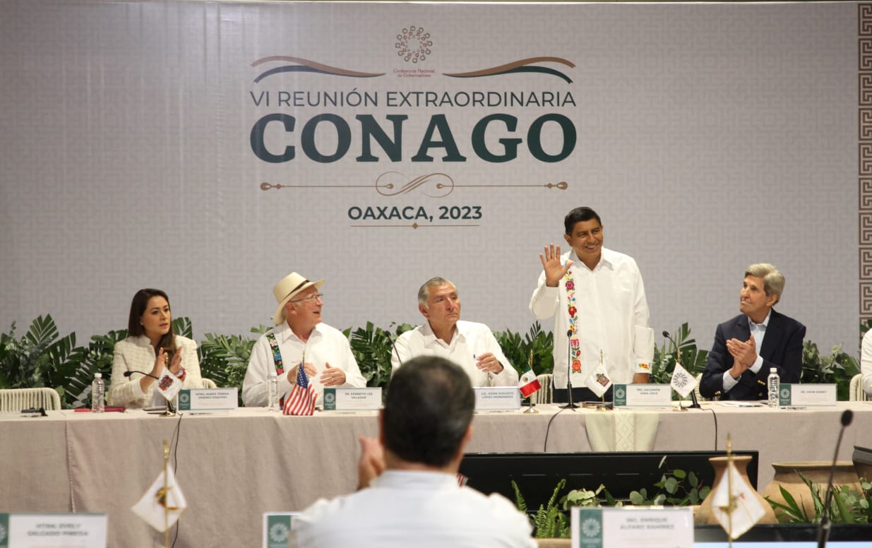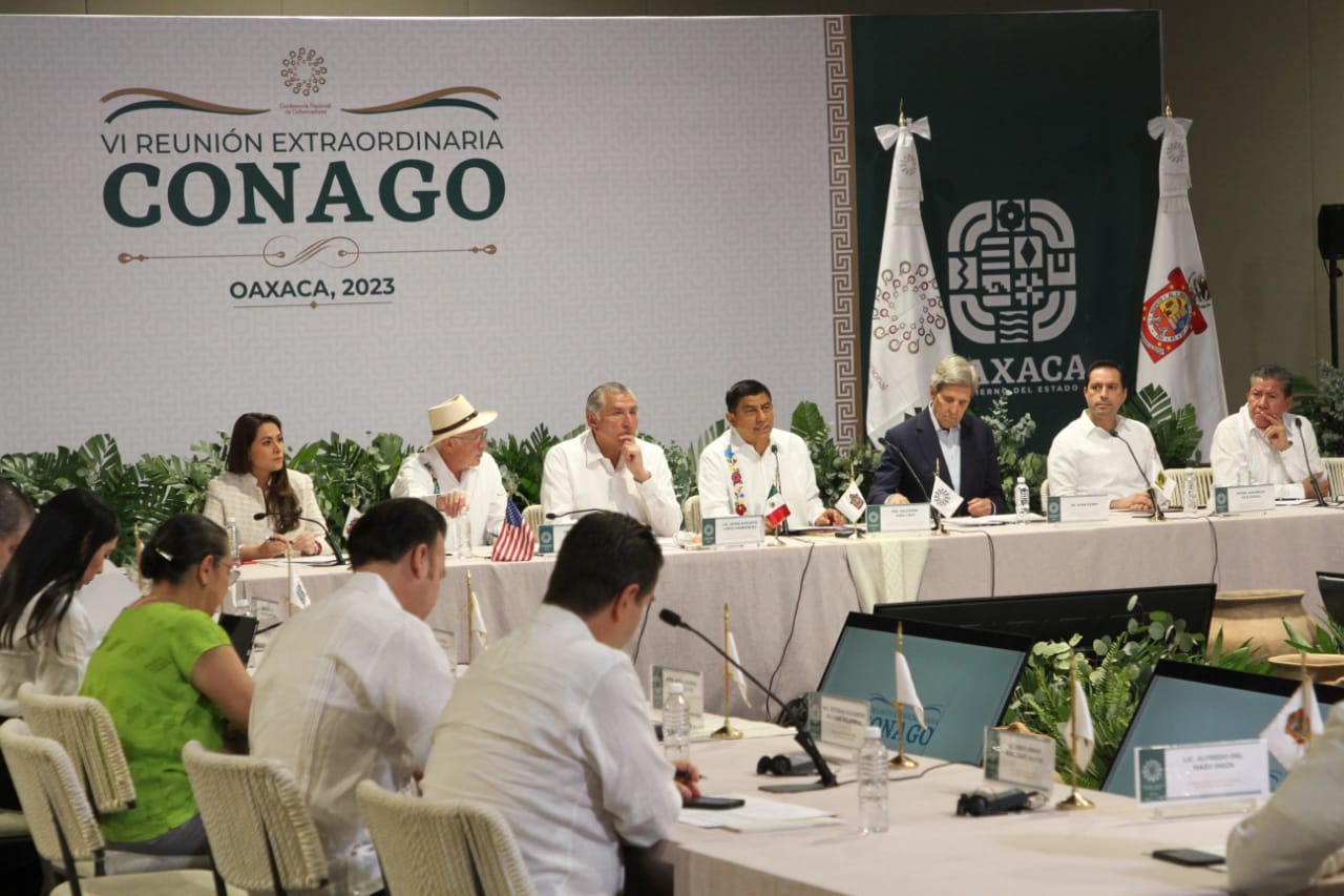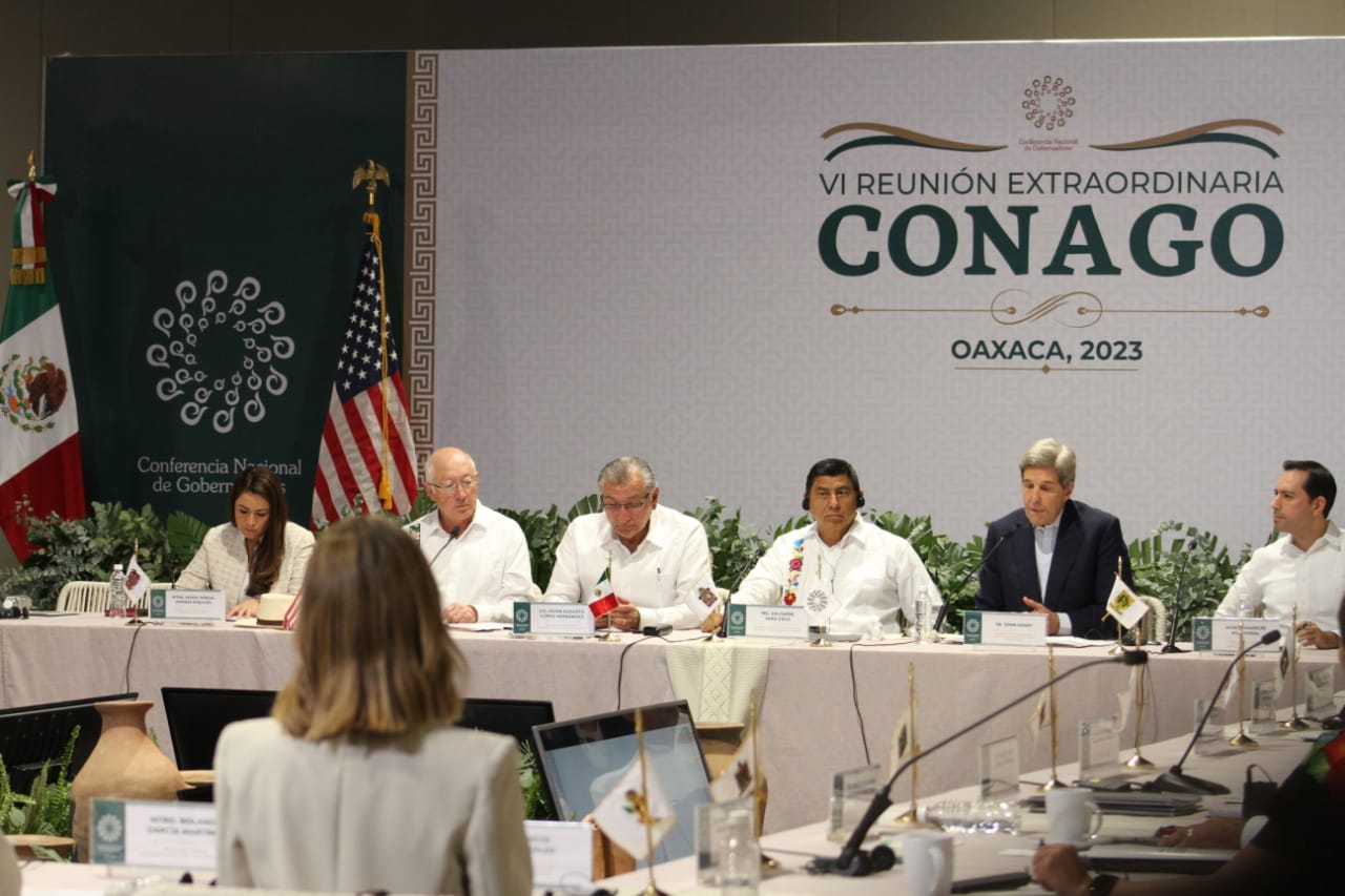 Santa Lucía del Camino, Oax. 22 de marzo de 2023. La VI Reunión Extraordinaria de la Conferencia Nacional de Gobernadores (Conago), que preside el Gobernador de Oaxaca Salomón Jara, representa un encuentro histórico que por primera vez contó con la presencia de John Kerry, enviado especial del Presidente de los Estados Unidos, y del Excelentísimo Embajador Ken Salazar.