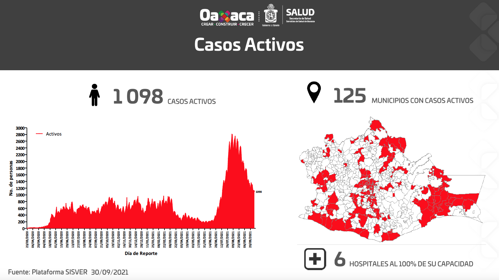 Oaxaca de Juárez, Oax. 30 de septiembre de 2021.- El mes de septiembre finaliza con nueve mil 370 casos acumulados de COVID-19, así como 535 lamentables defunciones por este virus, y nueve mil 634 personas se han recuperado, informaron los Servicios de Salud de Oaxaca (SSO).