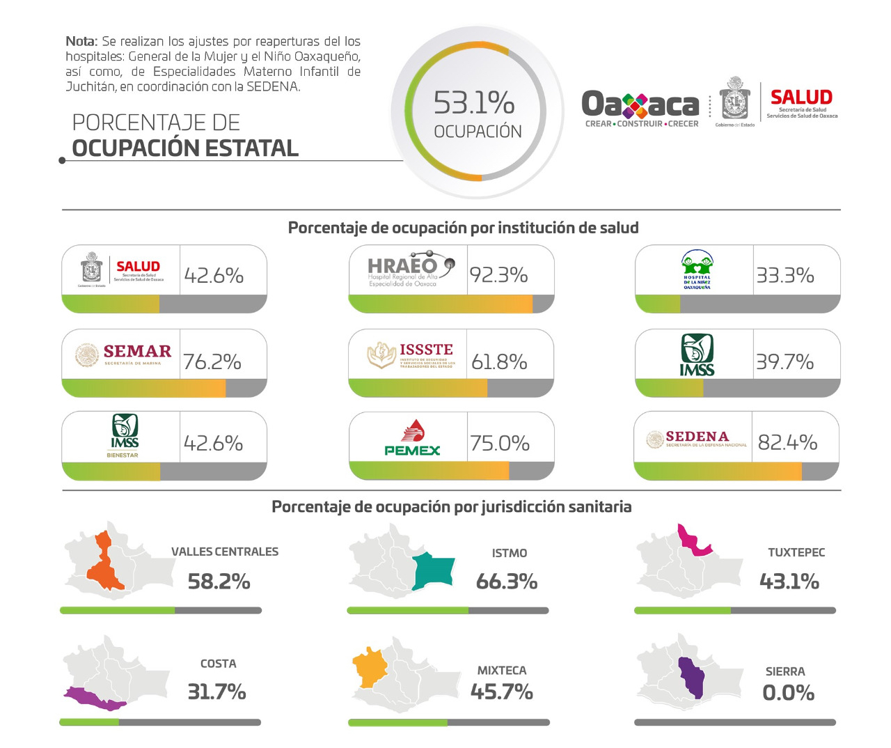 En relación a las camas ocupadas por Jurisdicción Sanitaria, sobresale el Istmo con 66.3%, Valles Centrales con 58.2%, la Mixteca con un 45.7%, seguido de Tuxtepec 43.1%, y Costa 31.7% , haciendo un global del 53.1%.